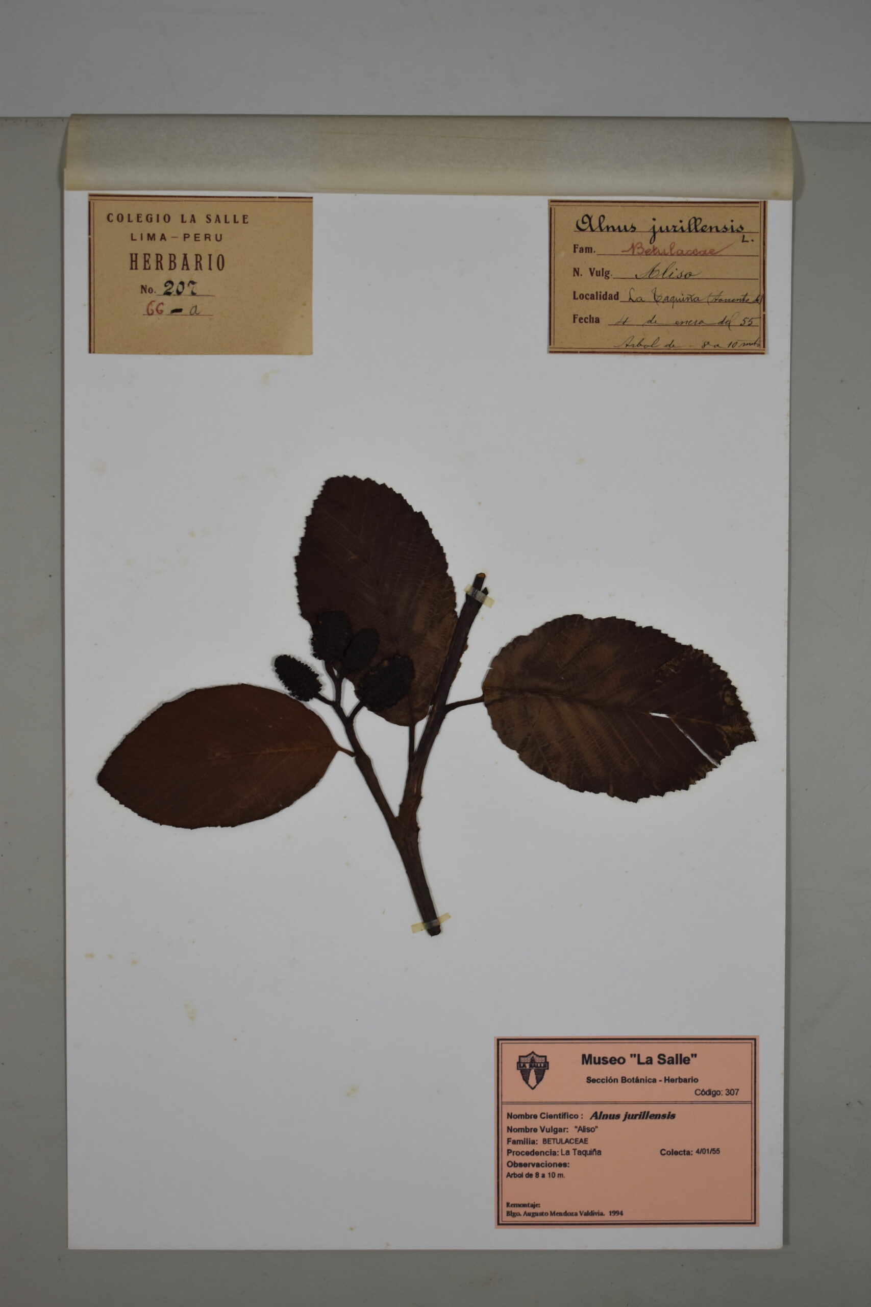 Este espécimen de nuestro Herbario pertenece a la familia Betulaceae y procede de La Taquiña. Corresponde a la especie Alnus jurullensis, conocida comúnmente como aliso. Es un árbol de crecimiento rápido y follaje denso, que puede alcanzar más de 20 metros de altura. Se desarrolla en zonas templadas y húmedas, especialmente cerca de ríos o quebradas, y cumple un importante papel ecológico al mejorar la fertilidad del suelo mediante la fijación de nitrógeno.
