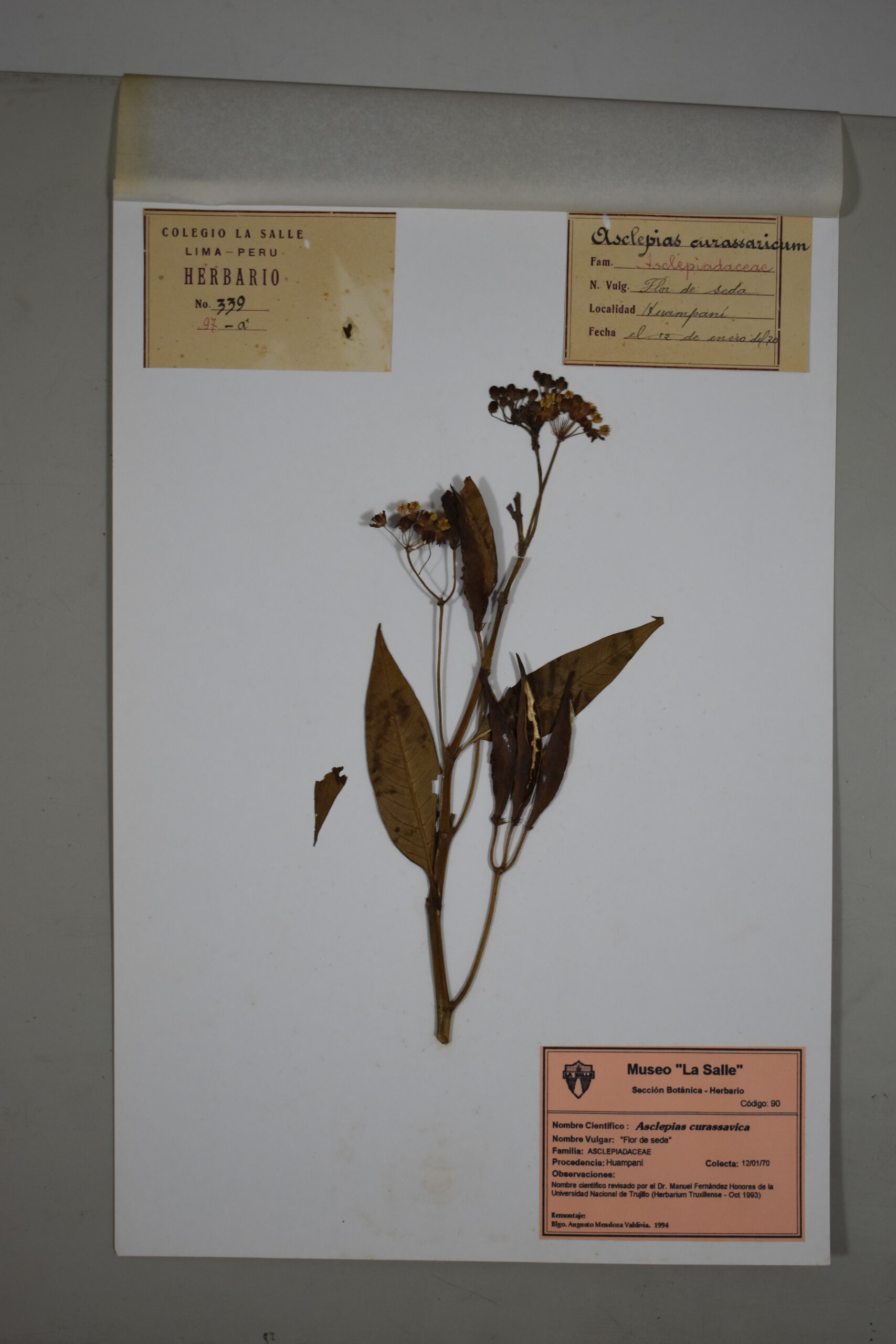 Este espécimen de nuestro Herbario pertenece a la familia Asclepiadaceae y procede de Huampaní. Corresponde a la especie Asclepias curassavica, conocida comúnmente como flor de seda. Es una planta herbácea perenne de flores pequeñas, anaranjadas y rojas, que atraen a mariposas y otros polinizadores, en especial a las monarcas. Se adapta fácilmente a zonas templadas y soleadas, y se cultiva con frecuencia por su valor ornamental y su importancia ecológica en la conservación de especies polinizadoras.