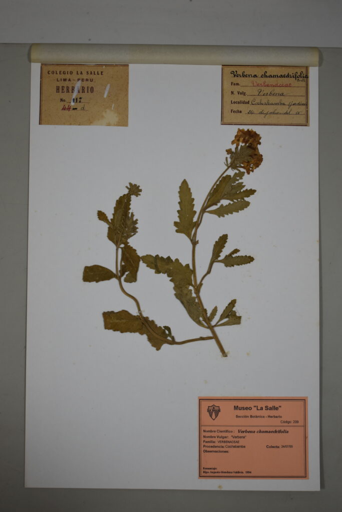 Verbena chamaedrifolia, conocida como verbena, pertenece a la familia Verbenaceae y proviene de Cochabamba. Es una planta herbácea de flores