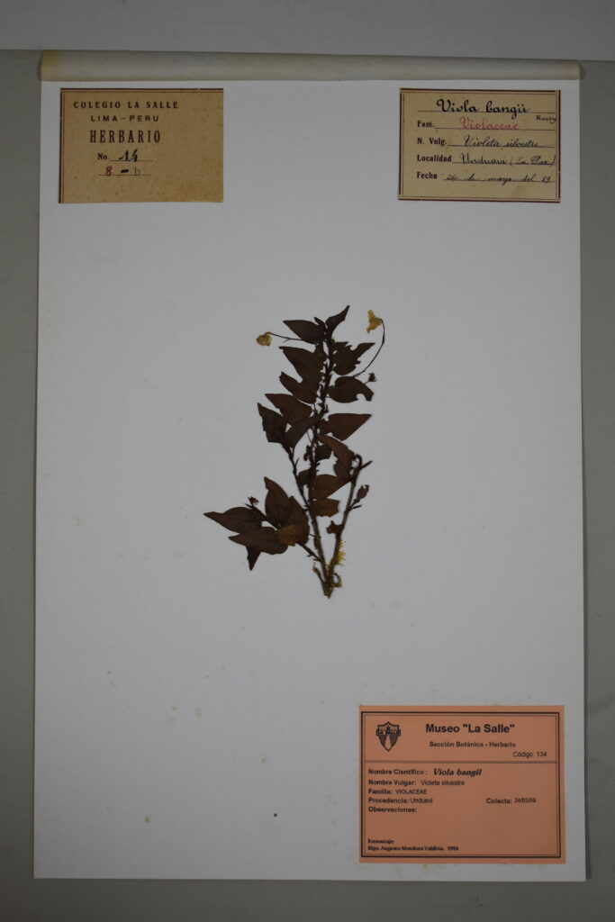 Viola bangii, conocida como violeta silvestre, pertenece a la familia Violaceae y proviene de Unduavi. Es una planta herbácea que
