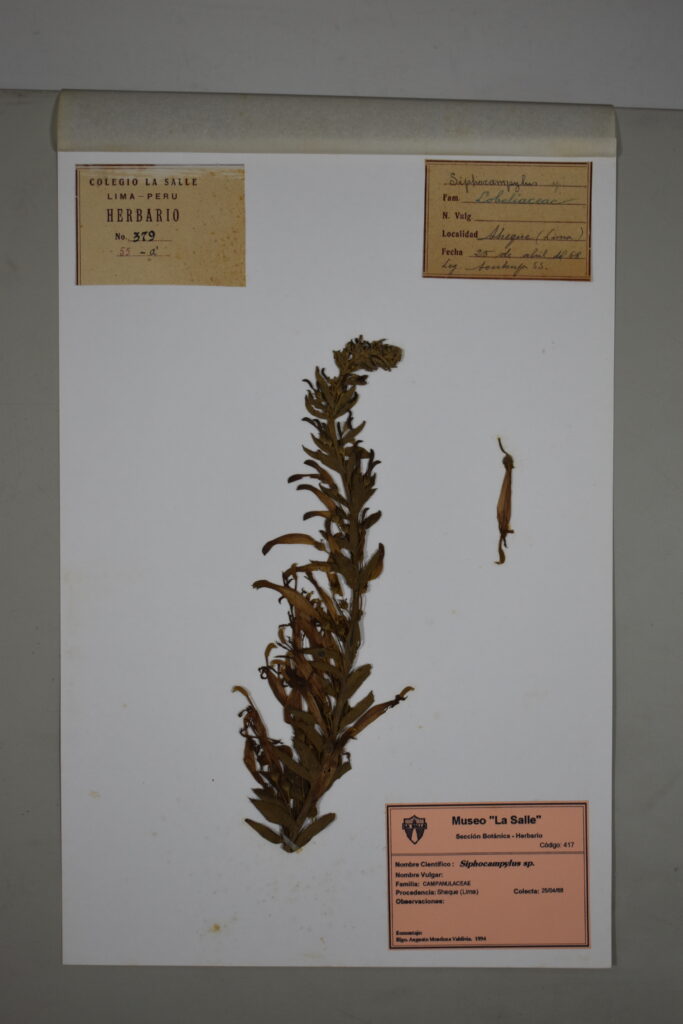 Este espécimen de nuestro Herbario pertenece a la familia Campanulaceae y procede de Sheque (Lima). Corresponde al género Siphocampylus sp.,