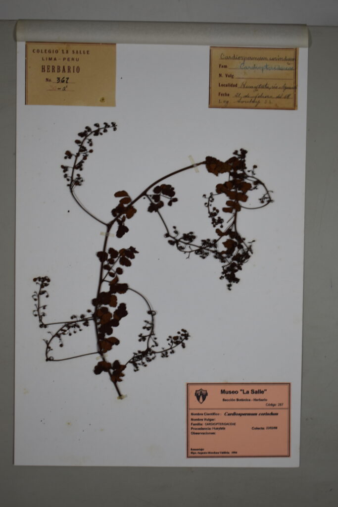 Este espécimen de nuestro Herbario pertenece a la familia Cardiopteridaceae y procede de Huaytata. Corresponde a la especie Cardiospermum corindum,
