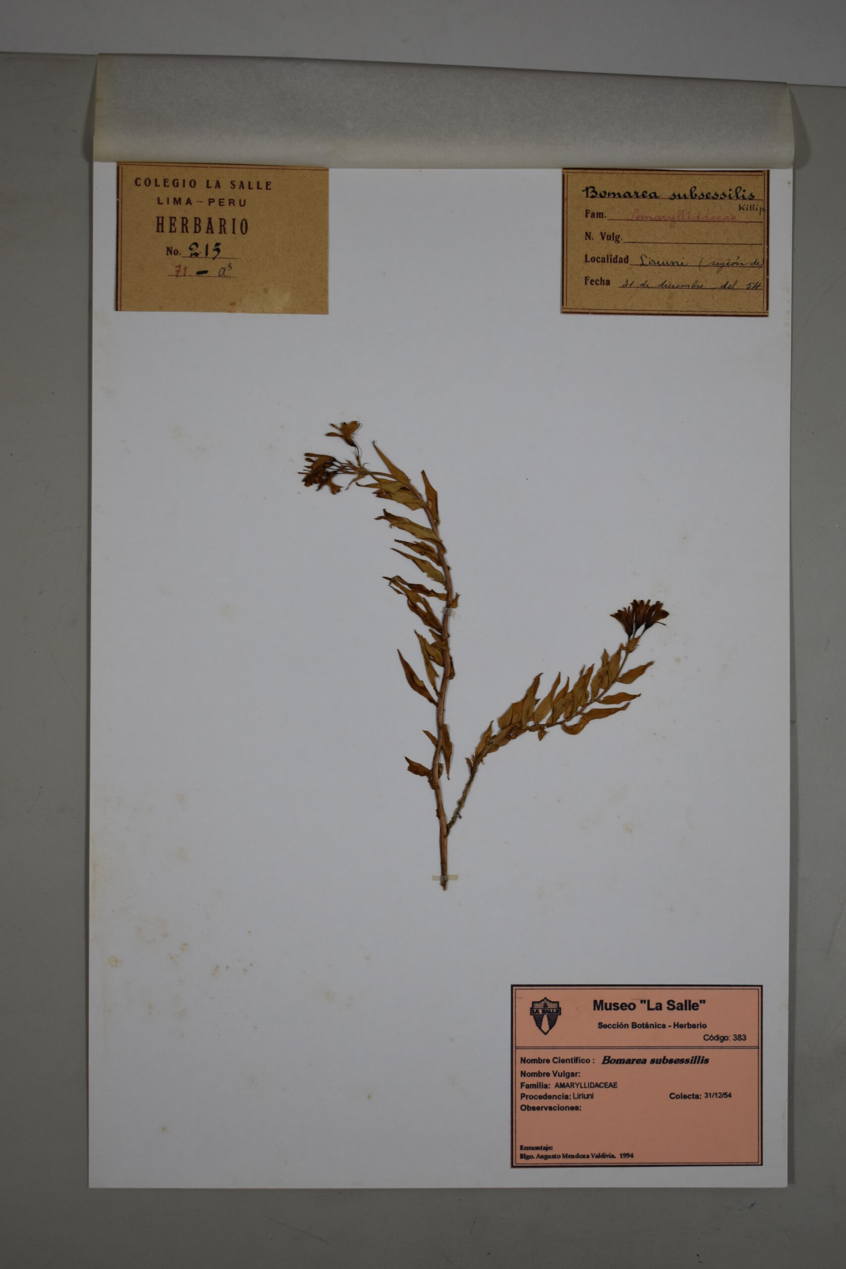 Este espécimen de nuestro Herbario pertenece a la familia Amaryllidaceae y procede de Liriuni. Corresponde a la especie Bomarea subsessilis, una planta trepadora que se caracteriza por sus flores colgantes y coloridas. En el Perú, las especies del género Bomarea crecen en los bosques húmedos andinos y en las cejas de selva, donde aportan belleza al paisaje y sirven de alimento a diversos polinizadores.