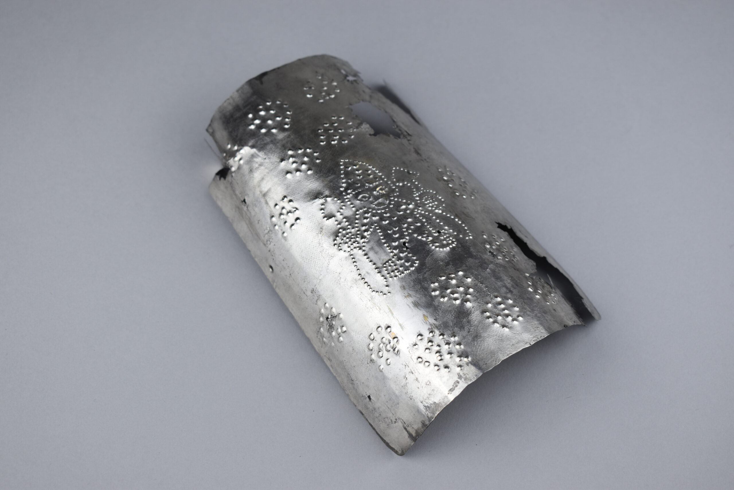 Brazalete laminado que presenta catorce grupos de 15 puntos cada uno aproximadamente. En el centro de estas agrupaciones, se observa un personaje frontal con los brazos y piernas extendidas, sosteniendo una vara en cada extremo. Hacia los lados largos hay dos perforaciones, por lo que podría haber sido usada para ser atadas.