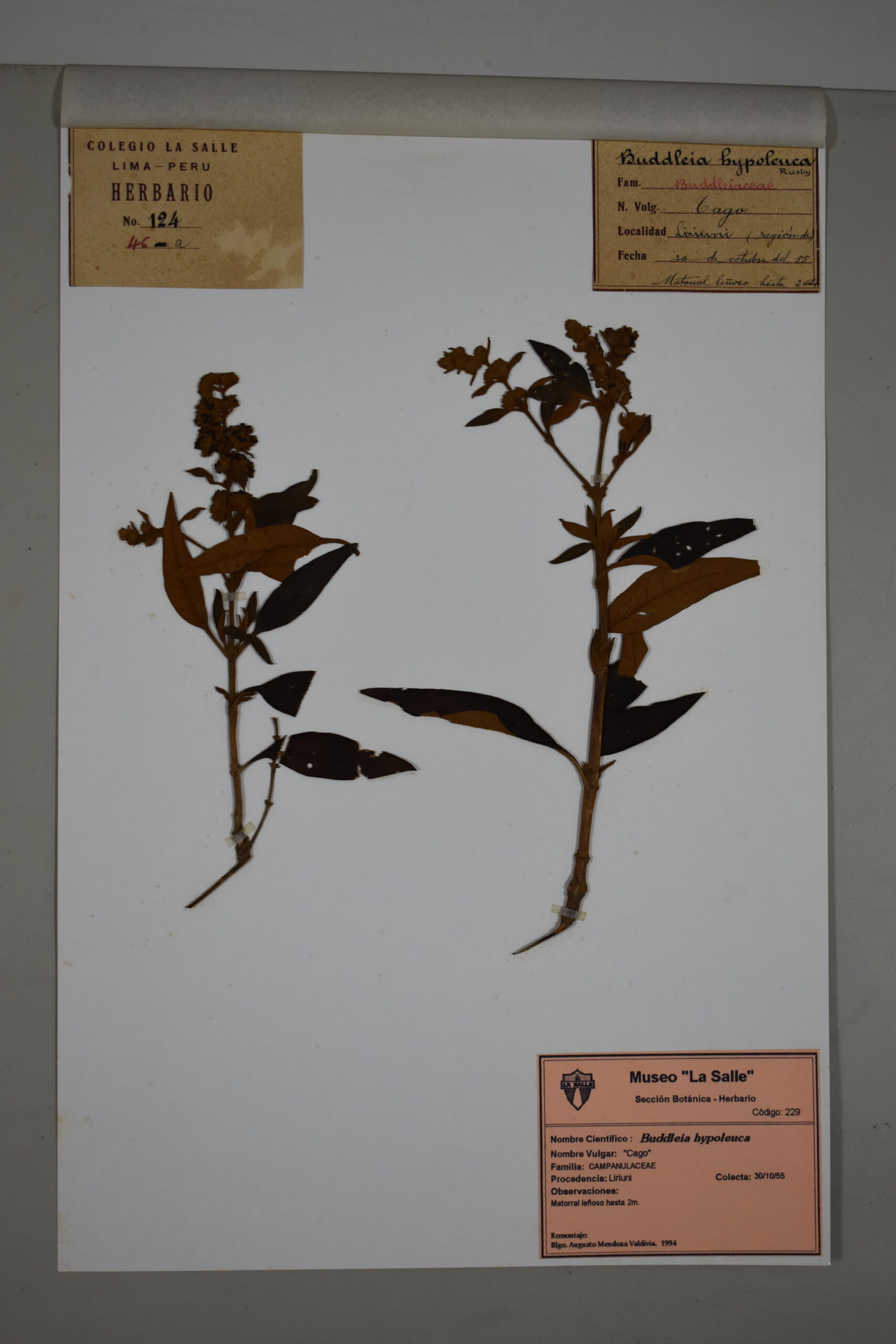 Este espécimen de nuestro Herbario pertenece a la familia Campanulaceae y procede de Liriuni. Corresponde a la especie Buddleja hypoleuca, conocida comúnmente como cago. Es un arbusto de ramas delgadas y hojas alargadas con el envés blanquecino, que produce racimos de pequeñas flores lilas o violetas. Crece en zonas templadas de montaña y es apreciado por atraer mariposas y otros polinizadores.