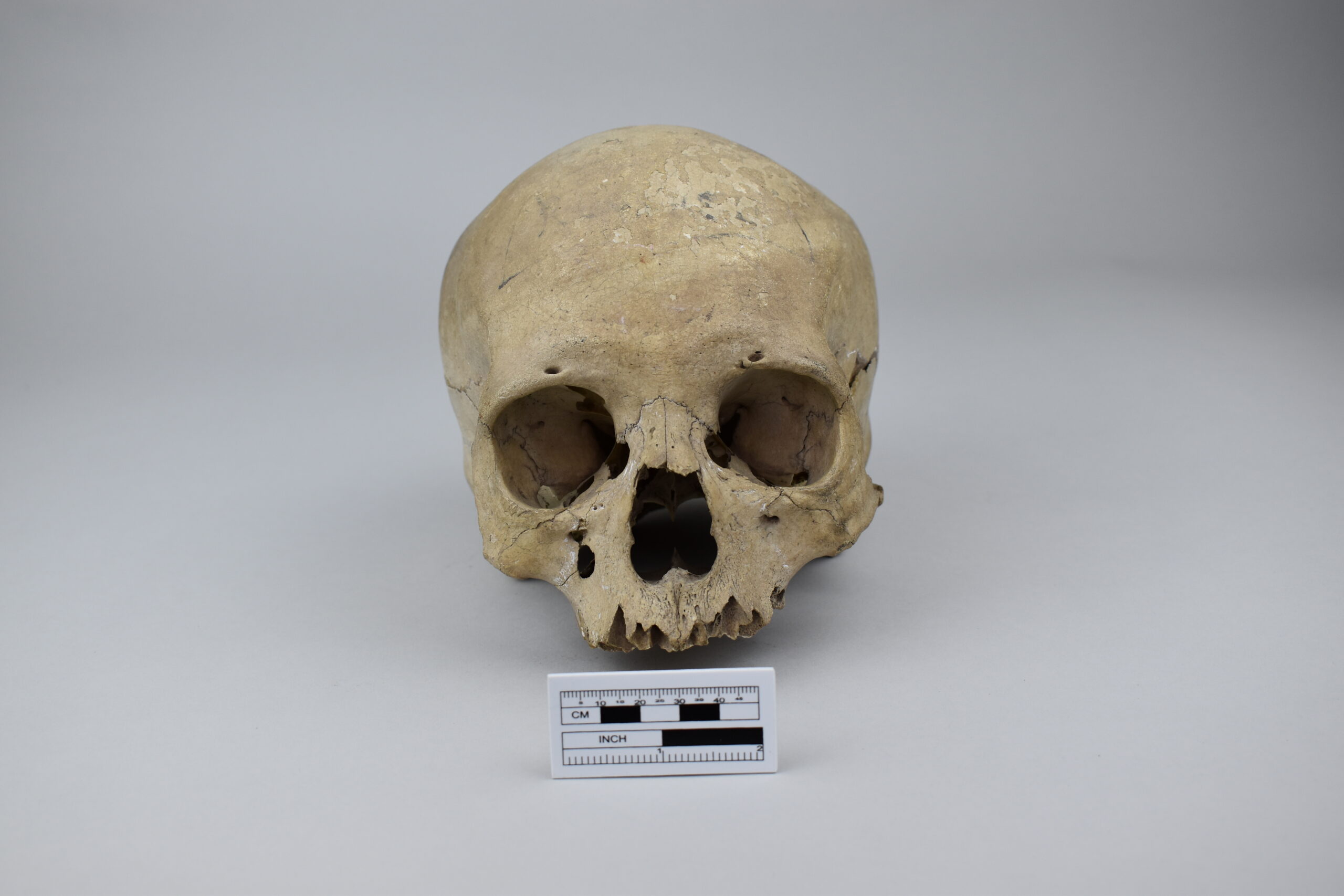 Cántaro Huari cara-gollete que representa a personaje antropomorfo con pintura facial y pectoral.