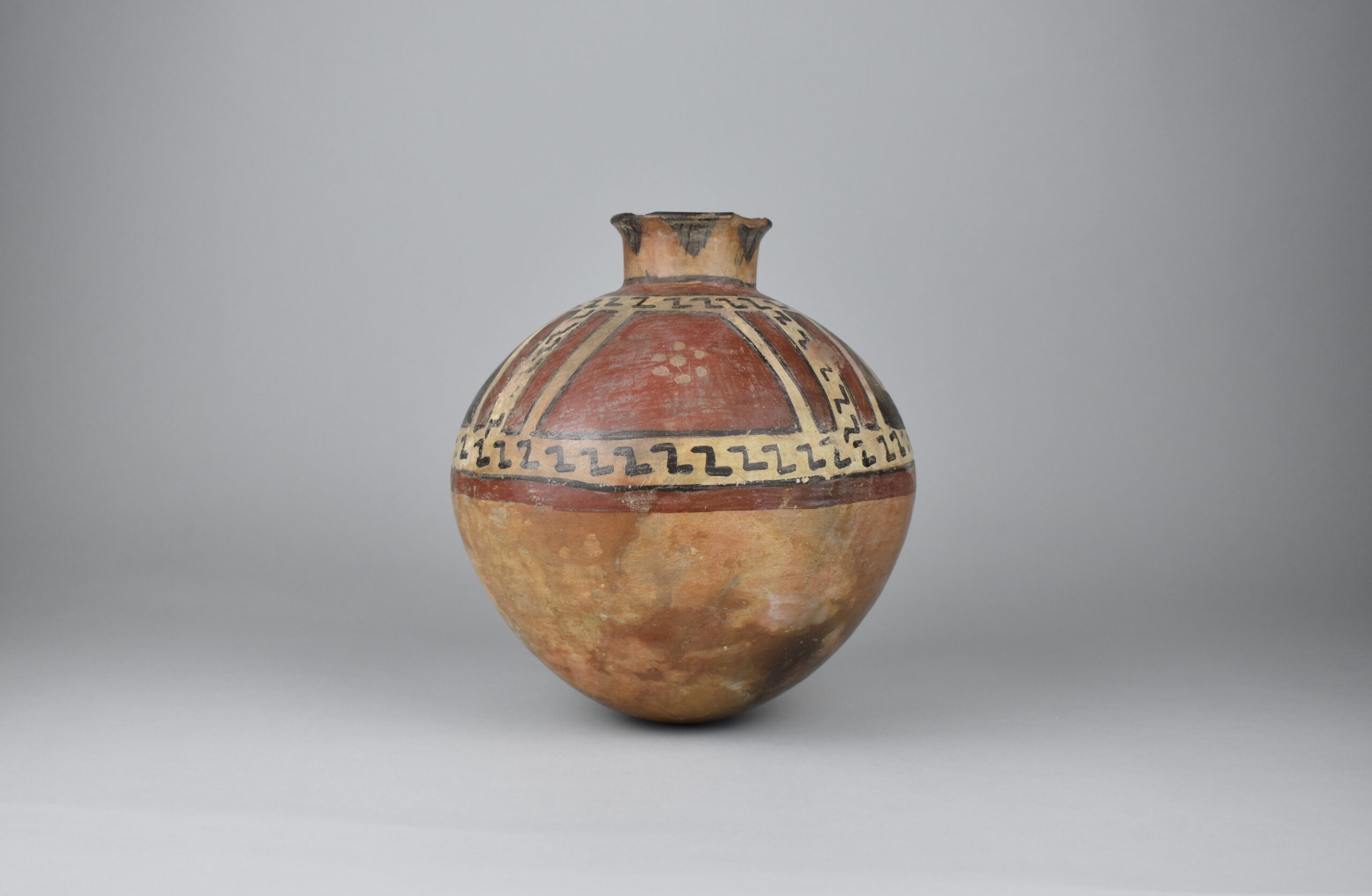 Cántaro con diseños geométricos de líneas, puntos, trapecios, triángulos y formas en “Z”.