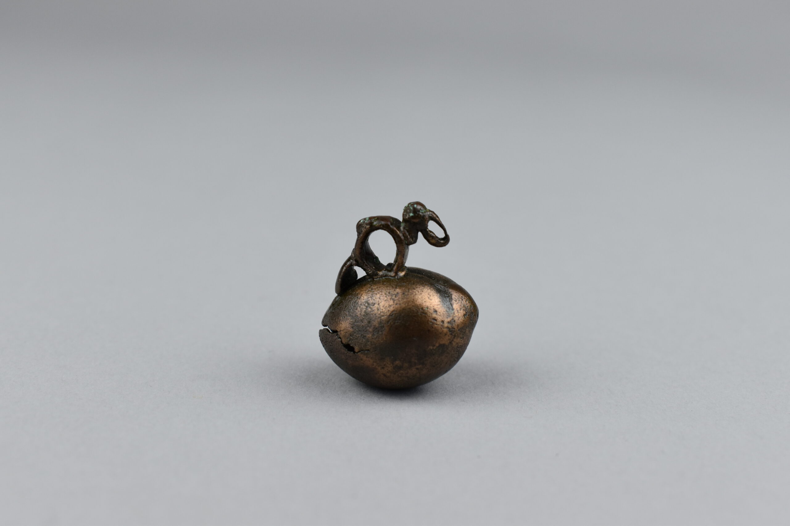 Presenta un cuerpo ovoide con abertura central. En la parte superior hay una decoración que representa un ave. En el interior, se encuentra una bolita que emite sonido al agitar el artefacto.
