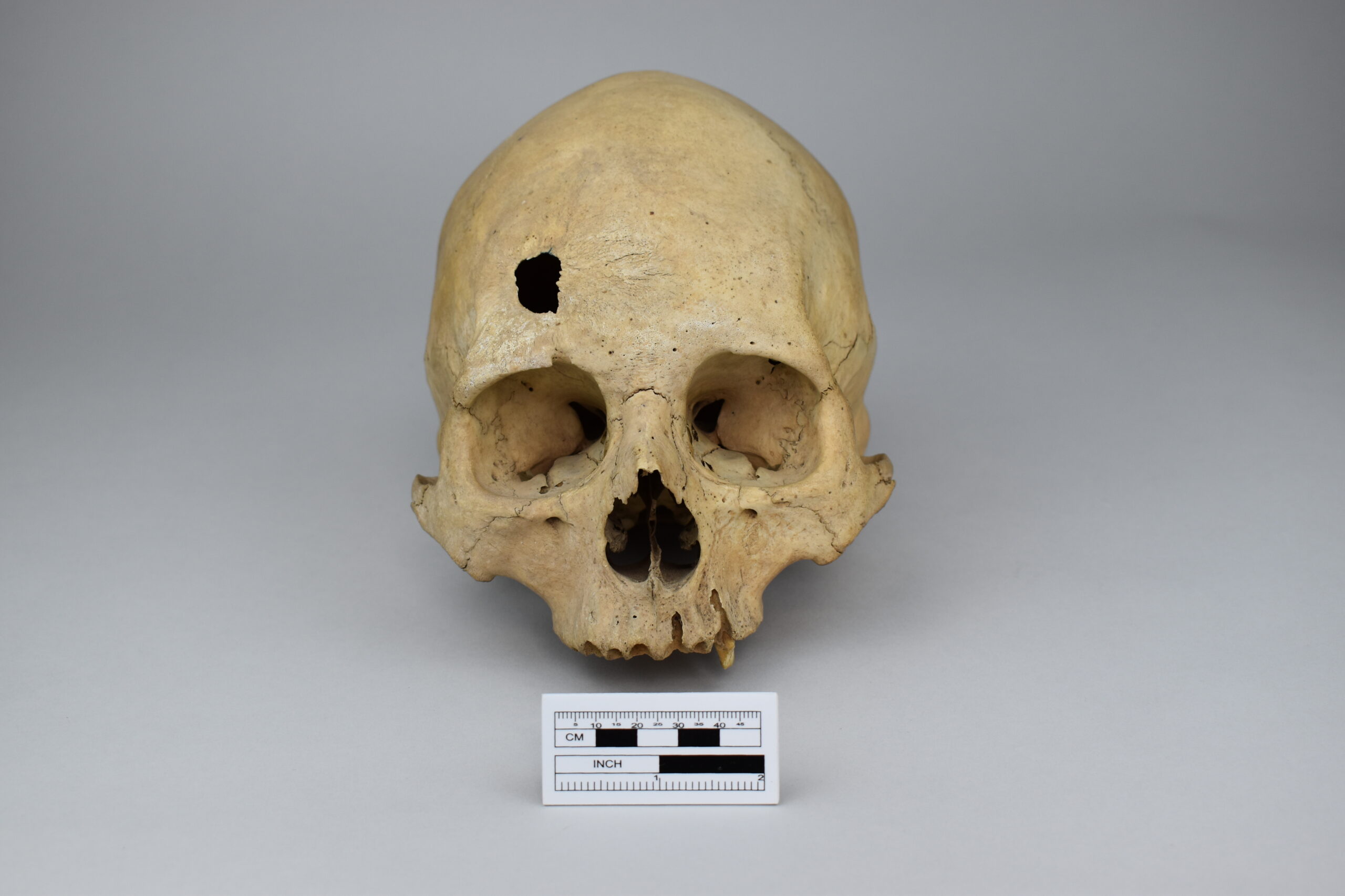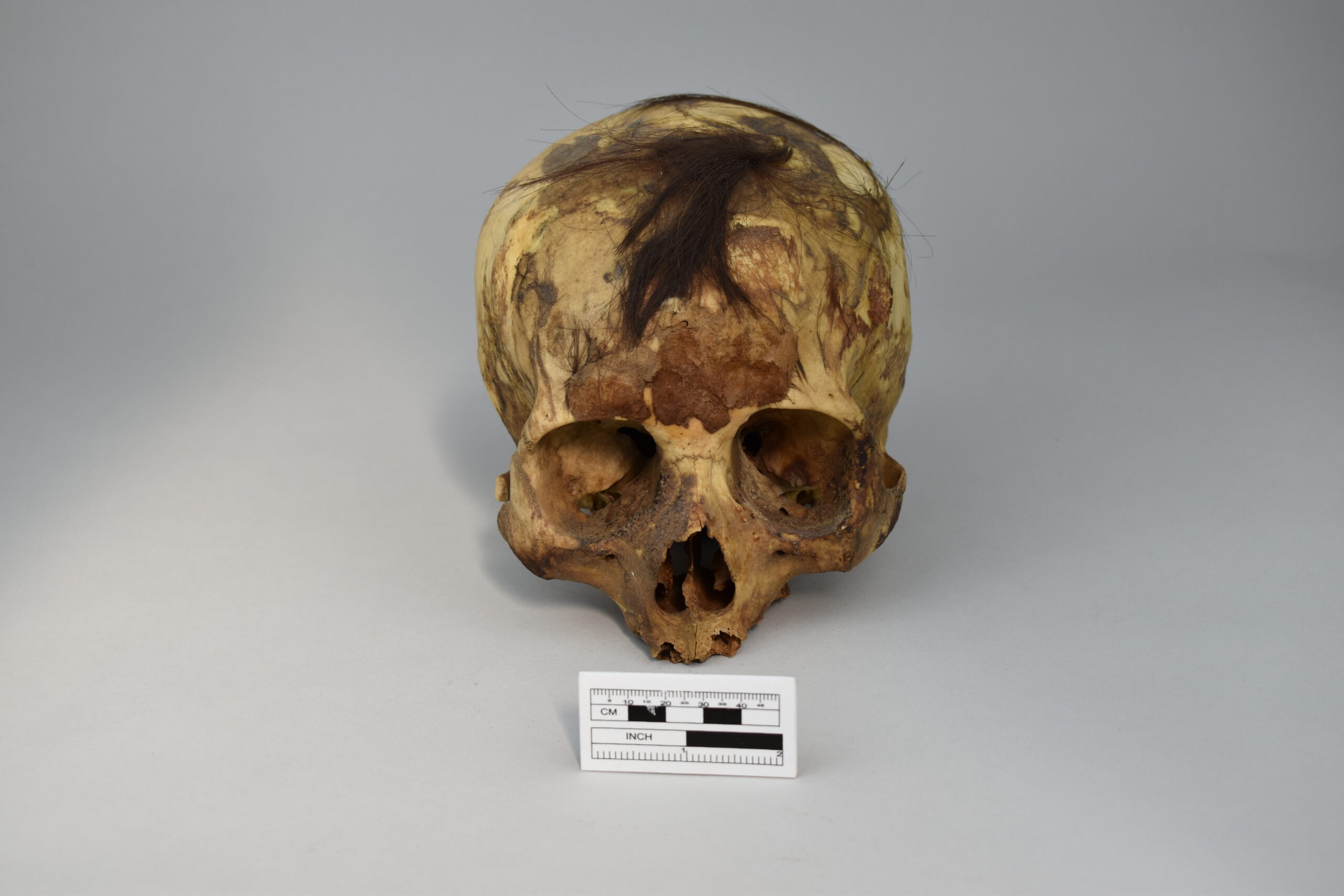 Huso de madera con dos puntas con incisiones lineales en la madera. Desde el extremo izquierdo se observan 7 líneas verticales juntas, más una incisión. En el centro posee líneas horizontales largas, 7 líneas verticales, 15 rectángulos negros de diferente tamaño en posición horizontal y 8 líneas verticales. Las líneas horizontales son, al parecer, más recientes. finalmente, el otro lado del huso posee 2 líneas delgadas y 2 gruesas de color negro.