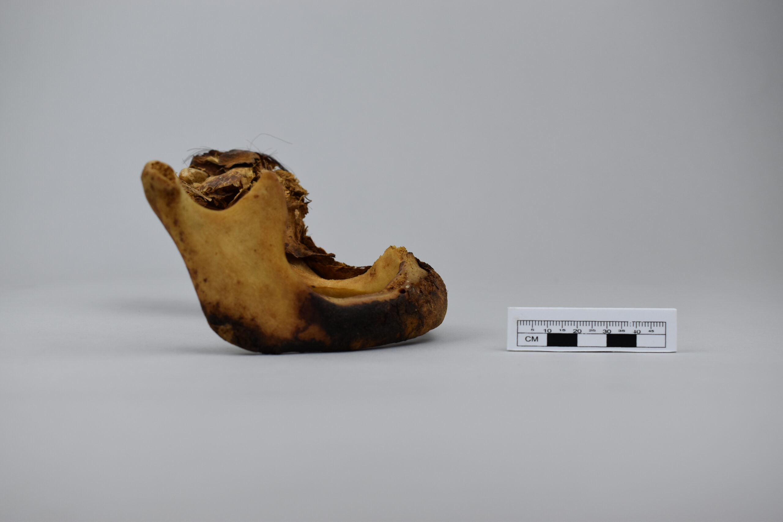 Mandíbula con restos de algodón, piel y cabello (MLS-OH-0024)