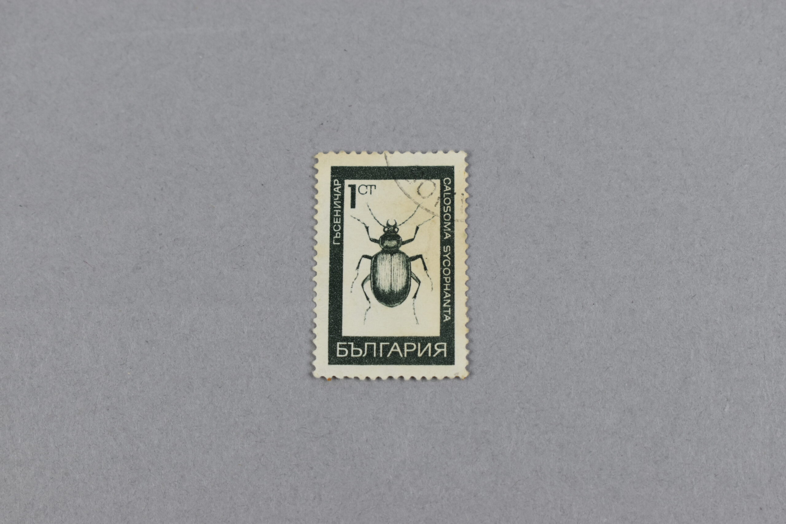 Estampilla de color verde alga, en el centro de la espampilla esta el dibujo del escarabajo: “Calosoma sycophanta”, arriba suyo esta el valor de la estampa.