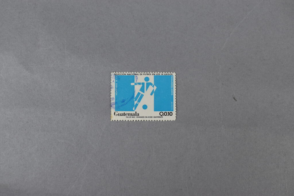 Bandera de color celeste y el medio blanco. Al medio de la bandera se observa una figura humana con un balón. Lado superior se menciona Homenaje a la selección nacional de futbol en los IX juegos panamericanos. Taller NAC-Grabados en acero-Guatemala.