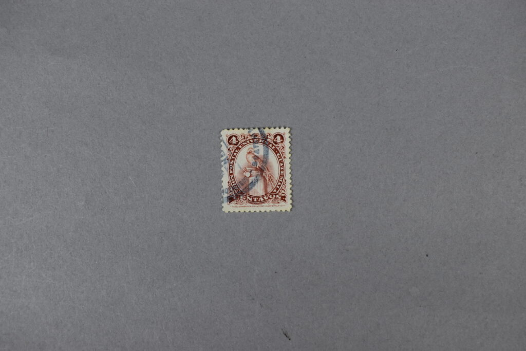 | Se observa un ave con grandes plumas, posada sobre un altar de fondo circular con bordes rectangulares, lleva nombre de union postal universal de Guatemala. Todo es de color marrón. |