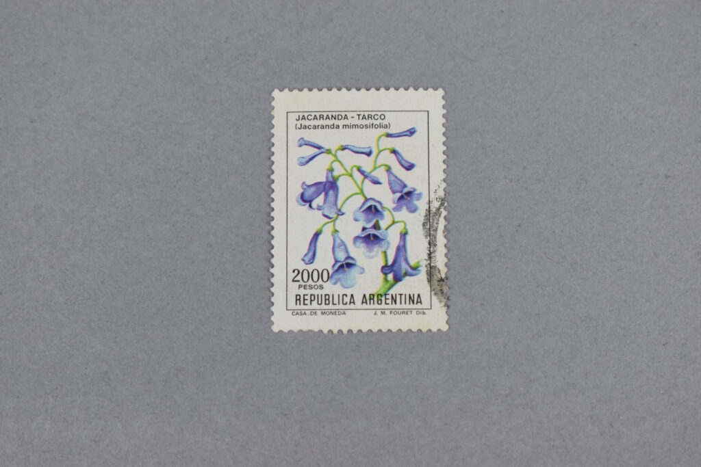 Estampilla cuyo marco es un rectángulo de línea fina, que adentro está el dibujo de las flores de: “JACARANDA”. En la parte superior está el nombre normal y el nombre científico del árbol. Por último, está el valor de la estampilla y el nombre del país en la parte inferior