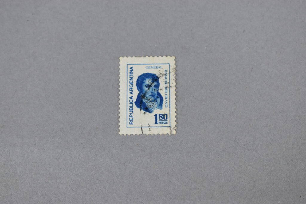 Estampilla de color azul cobalto, con marco rectangular de borde fino, adentro está el retrato de perfil izquierdo del abogado y general: “Manuel Belgrado”, abajo del cuello está el valor de la estampilla
