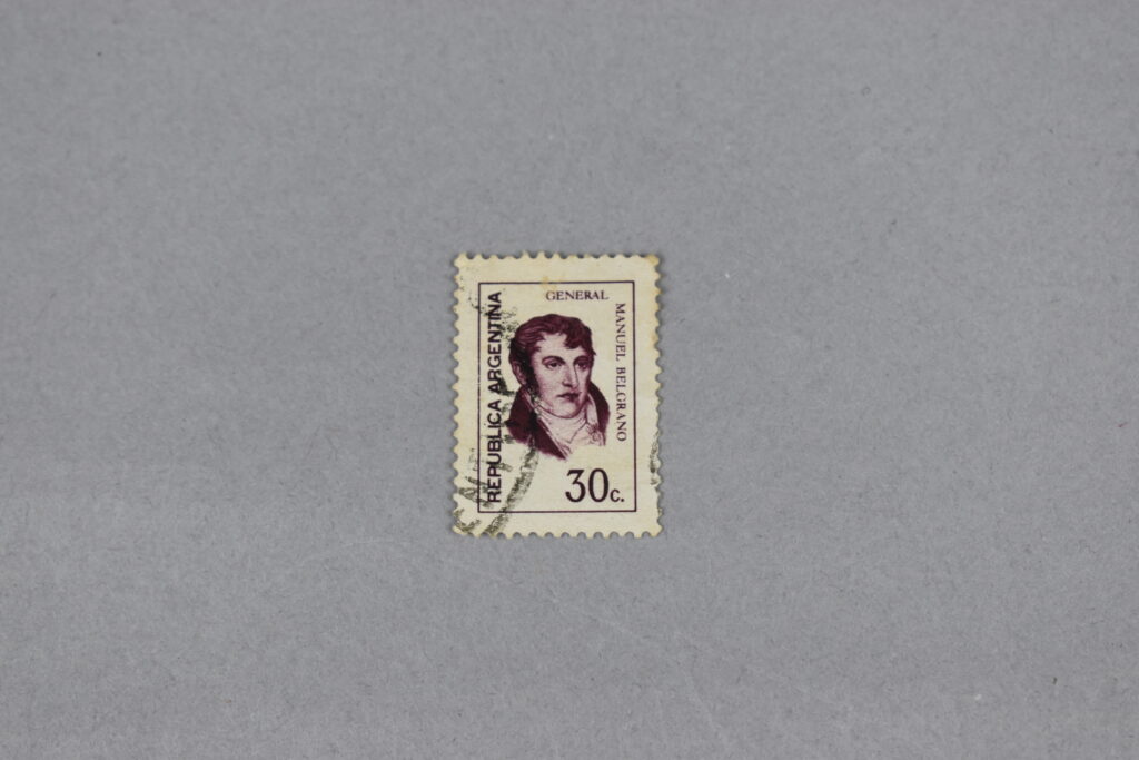 Estampilla de color purpura, con marco rectangular de borde fino, adentro está el retrato de perfil izquierdo del abogado y general: “Manuel Belgrado”, abajo del cuello está el valor de la estampilla