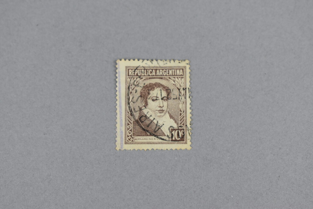 Estampilla con un rectángulo color marron con ilustración de hojas en ambos lados, en el centro del rectángulo está el retrato de perfil izquierdo del ex presidente de Argentina, entre 1826 a 1827: “Bernardino Rivadavia”. En la parte inferior izquierda hay un cuadrado con el valor de la estampilla