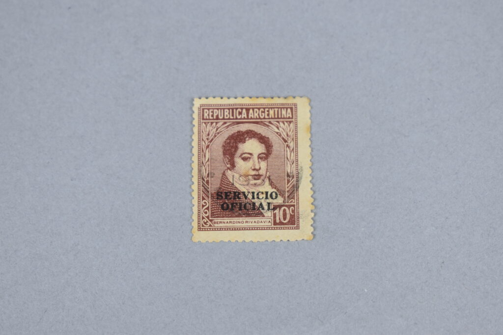 Estampilla con un rectángulo color morado magenta con ilustración de hojas en ambos lados, en el centro del rectangular está el retrato de perfil izquierdo del ex presidente de Argentina, entre 1826 a 1827: “Bernardino Rivadavia”. En la parte inferior izquierda hay un cuadrado con el valor de la estampilla