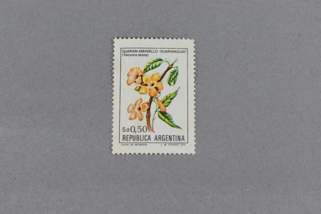 Estampilla con marco rectangular de línea fina, que adentro está el dibujo de una: “FLOR DE GUARAN AMARILLO”, el valor está en la zona inferior derecho, con el nombre del país abajo suyo. En la parte izquierda está el nombre normal y el nombre científico