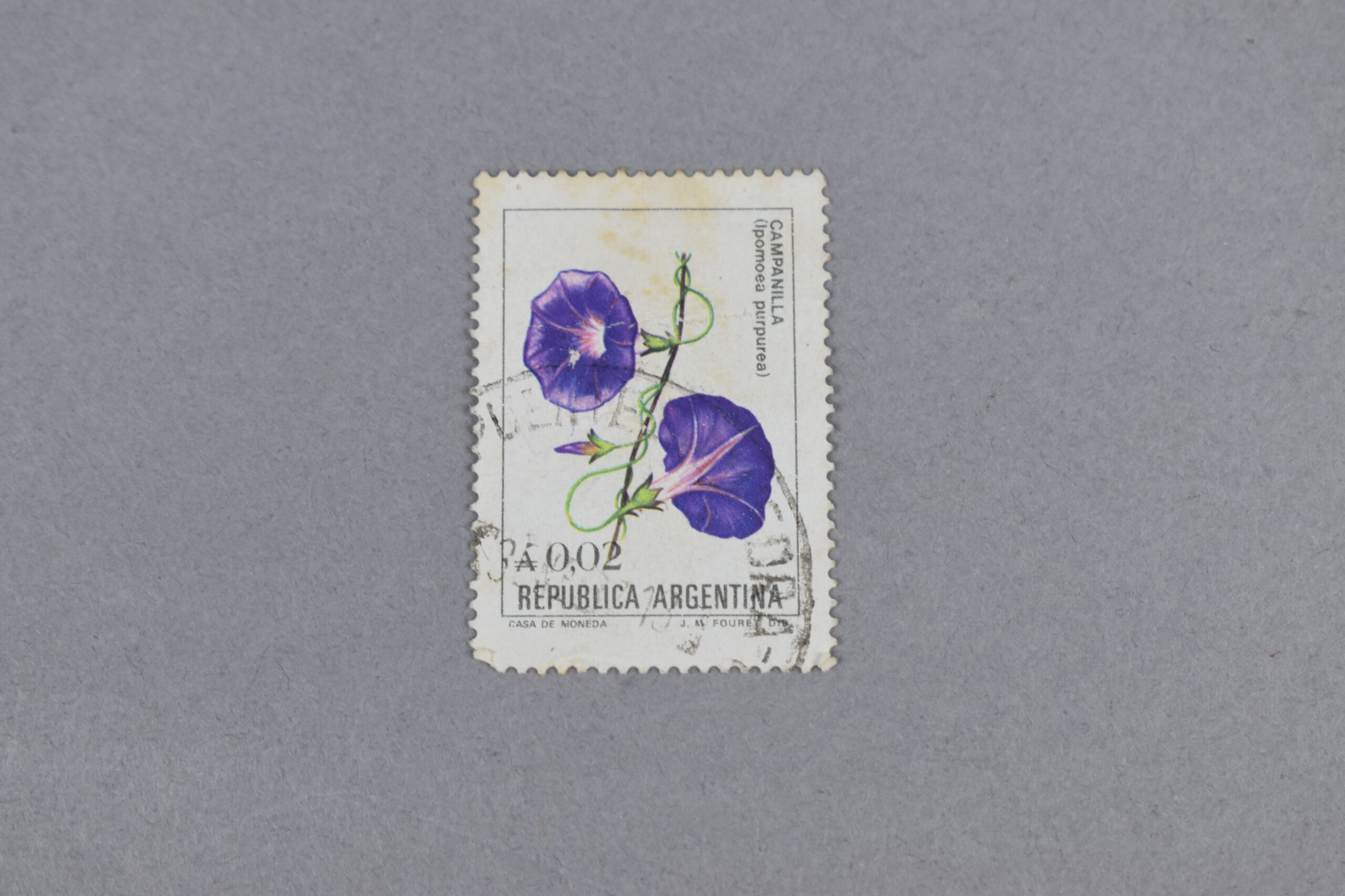 Estampilla que, dentro de un rectángulo de línea fina, que adentro está el dibujo de una flor de «CAMPANILLA», con el nombre normal y científico en la parte izquierda superior. En la parte inferior derecha está el valor de la estampilla y el nombre de la nación.