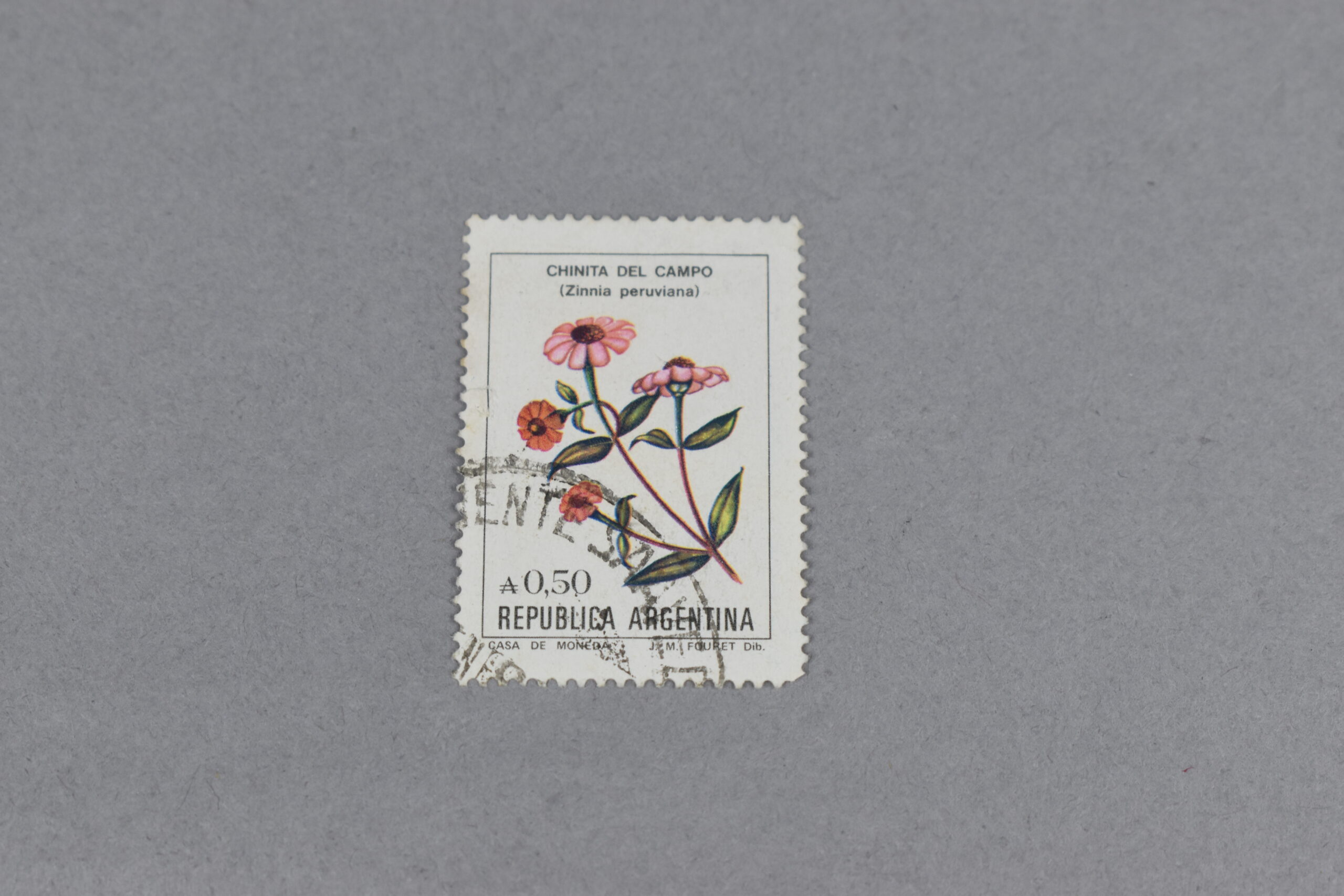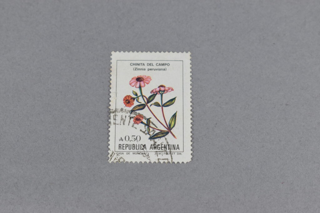 Estampilla que, dentro de un rectángulo de línea fina, que adentro está el dibujo de una flor de: «CHINITA DEL CAMPO», el valor está en la zona inferior derecho, con el nombre del país abajo suyo. En la parte superior está el nombre normal y el nombre científico de la flor.