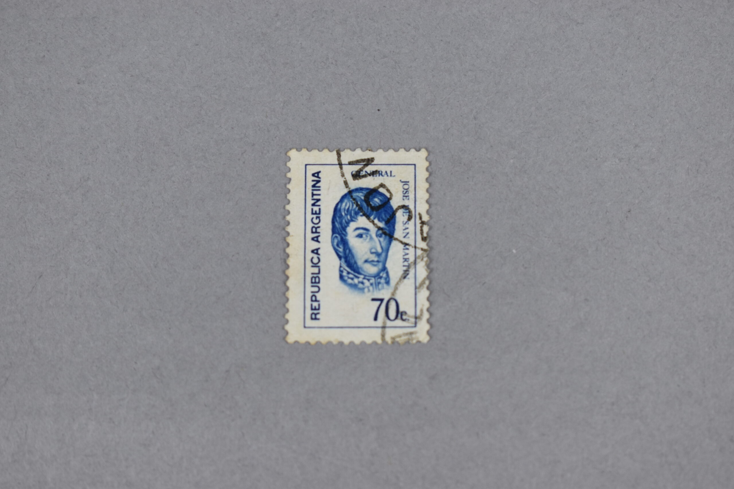 Estampilla de color azul, dentro de un rectángulo de borde fino, adentro está el retrato de perfil izquierdo del militar y libertador: «José de San Martín», abajo del cuello está el valor de la estampilla