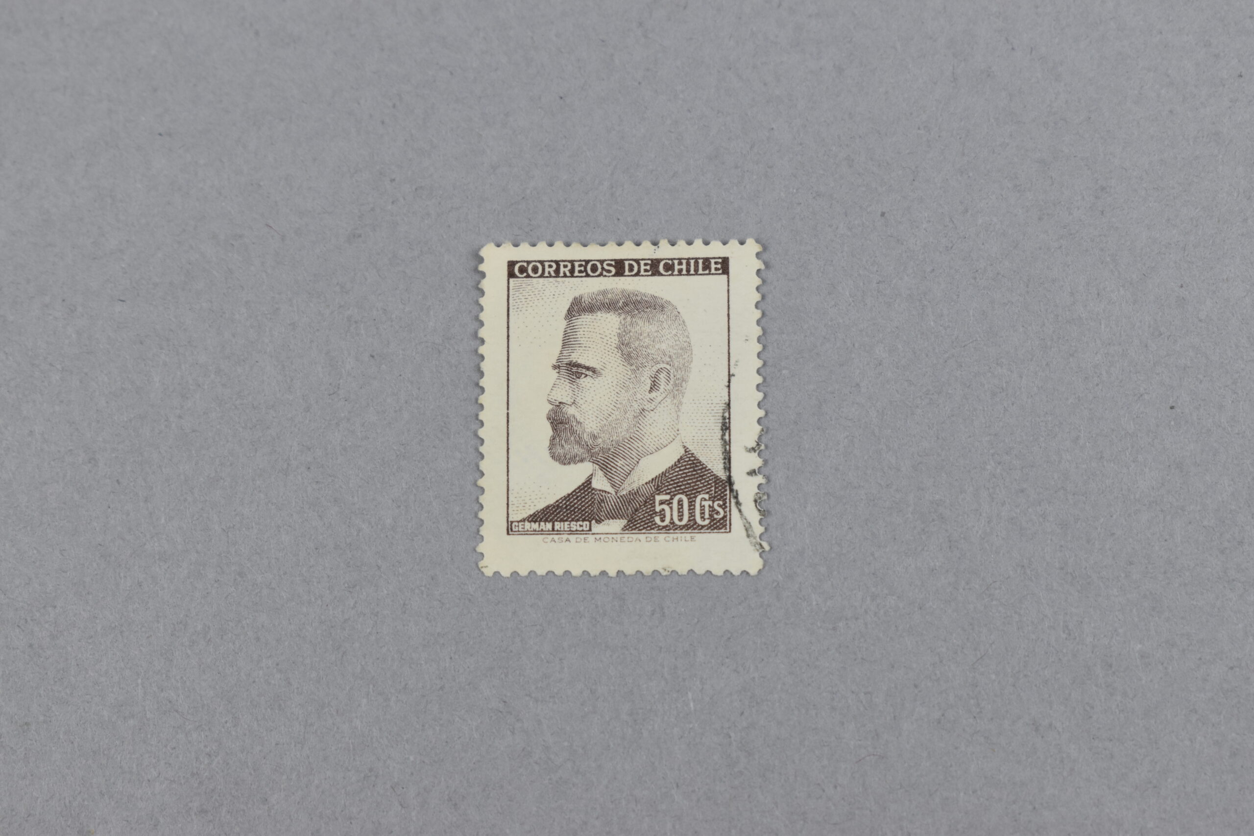 Estampilla que presenta rectángulo de color morado, en la parte central se encuentra el retrato de perfil derecho del abogado y político chileno: «Germán Riesco» (1854-1916). En la parte inferior derecha está el valor de la estampilla.
