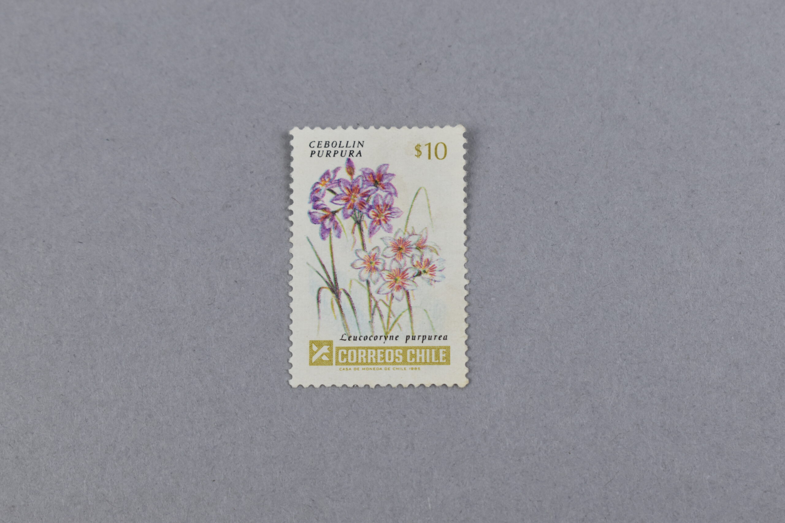 Estampilla en cuya parte central se encuentra un dibujo a todo color de la flor de: «CEBOLLÍN PÚRPURA», cuyo nombre común se encuentra en la parte superior izquierda y el nombre científico en parte inferior derecha. En la parte superior derecha se encuentra, escrito en color amarillo ámbar el valor de la estampilla. En la parte inferior se encuentra el símbolo del: «CORREOS CHILE».