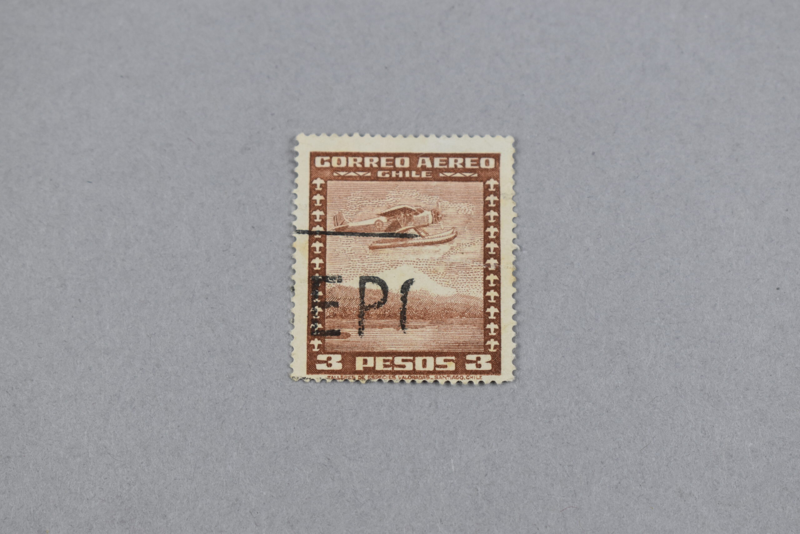 Estampilla que presenta un rectángulo de color anaranjado que presenta en su centro la ilustración de lo que parecería ser un hidroplano surcando el cielo y teniendo de fondo o vista un paisaje natural de un lago y una montaña. En la parte superior se encuentra escrito en color blanco: «CORREO AÉREO CHILE», en la parte inferior se encuentra el valor de la estampilla y tiene a los márgenes derecho e izquierdo pequeños dibujos que representan aviones monoplano