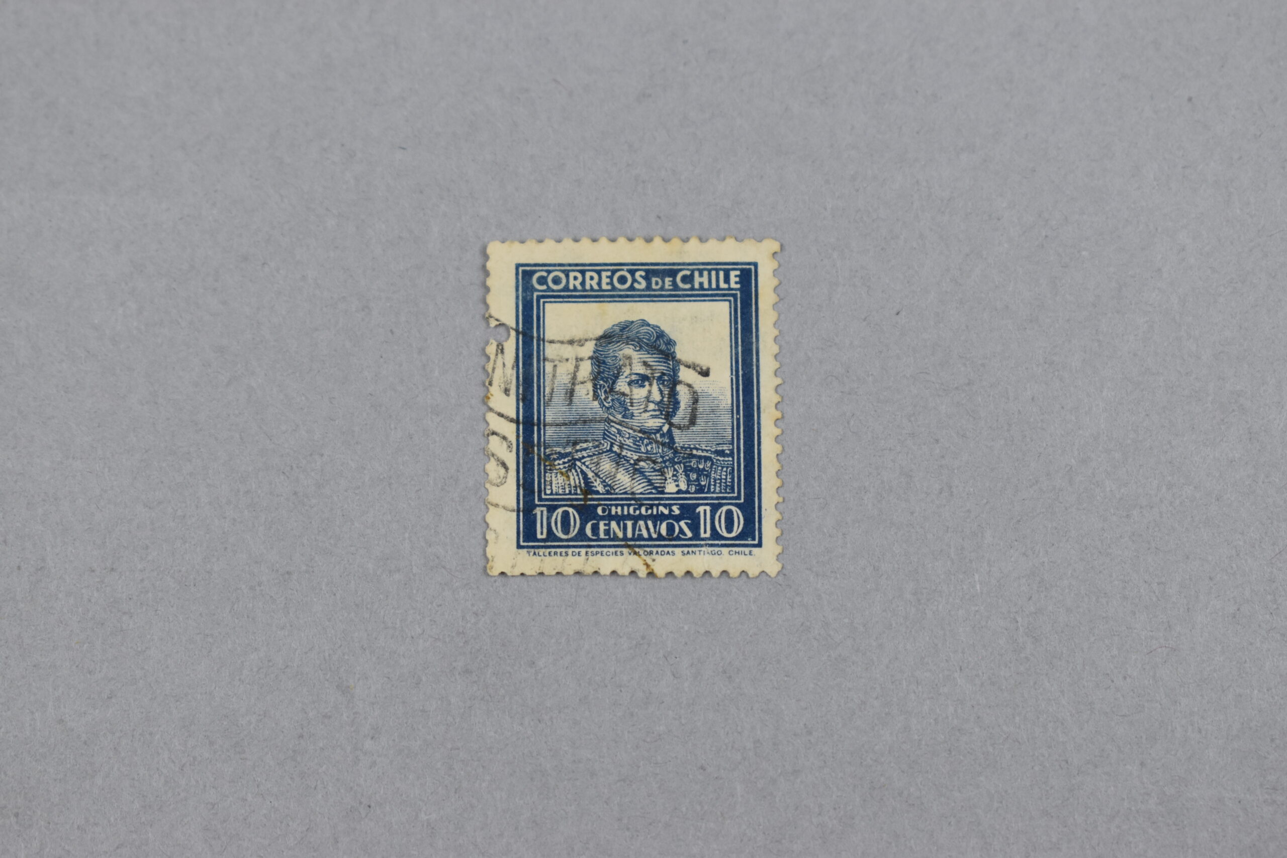 Estampilla que presenta en la parte central un cuadrado de color azul Prusia que en el que se encuentra el retrato del político, militar y director supremo de Chile Bernardo O’Higgins (1778-1842) en uniforme militar. En la parte inferior se encuentra sobre un fondo azul y en letras blancas el apellido: «O’HIGGINS» y el valor de la estampilla.