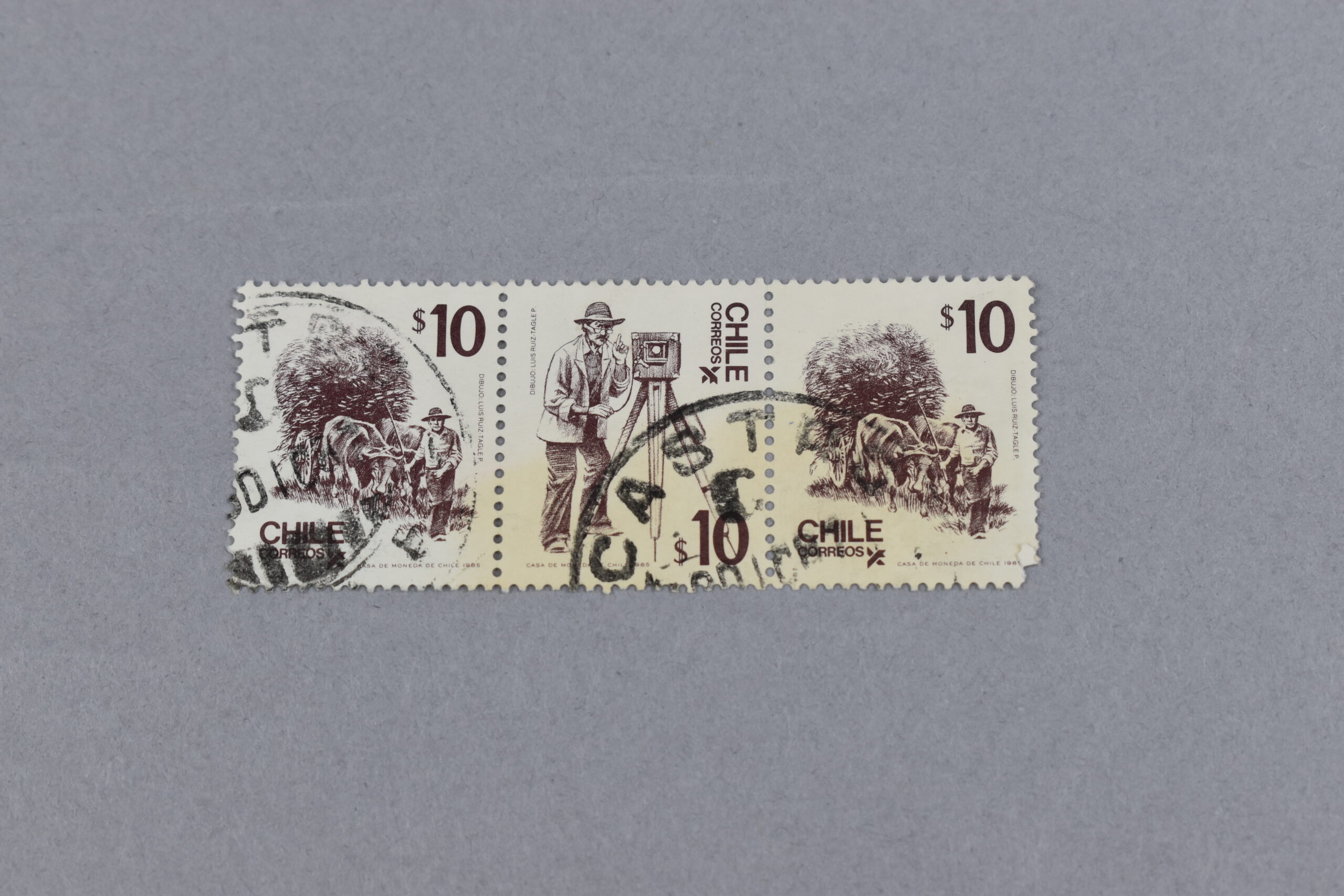 Estampillas unidas teniendo ilustraciones en blanco y negro de lo que parecen ser oficios y profesiones, y están situadas en este orden: Las estampillas izquierda y derecha contienen la ilustración de lo que parece ser un campesino o labrador tirando una carreta con heno o paja tirada por toros, en la estampilla del centro se puede apreciar la ilustración de un fotógrafo a punto de accionar su cámara. Las tres ilustraciones parecen ser hechas por el artista e ilustrador Luis Ruiz-Tagle P. El valor facial de las estampas se encuentra distribuido de la siguiente manera: en la derecha e izquierda se encuentra en la parte superior derecha y en la central en la parte inferior izquierda.