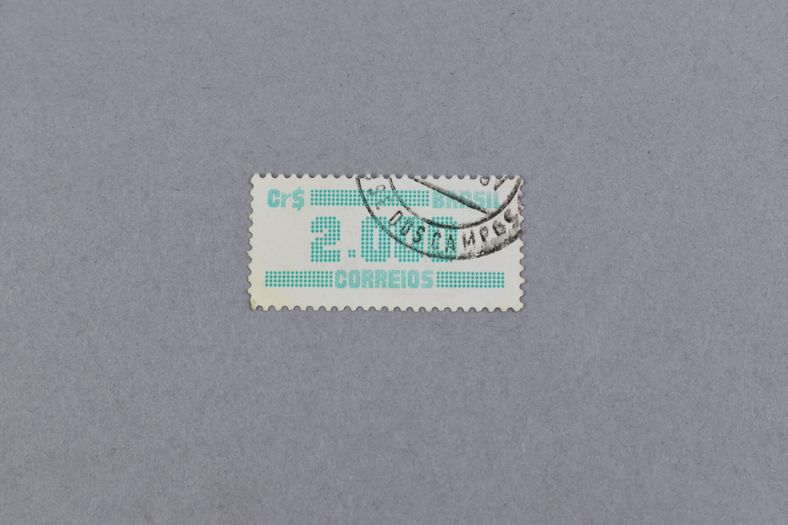 Estampilla rectangular de color blanco con letras y puntos color verde claro, los cuales forman tanto rectángulos como palabras, resaltando en la parte central lo que parece ser el número 2000 que a la vez funge como su valor facial. El código de la moneda se encuentra en la esquina superior izquierda (Cr$) y el nombre del país: «BRASIL» en la esquina superior derecha. En la parte inferior, cerrada por dos rectángulos hechos de puntos, se encuentra la palabra «CORREIOS» (Correos).
