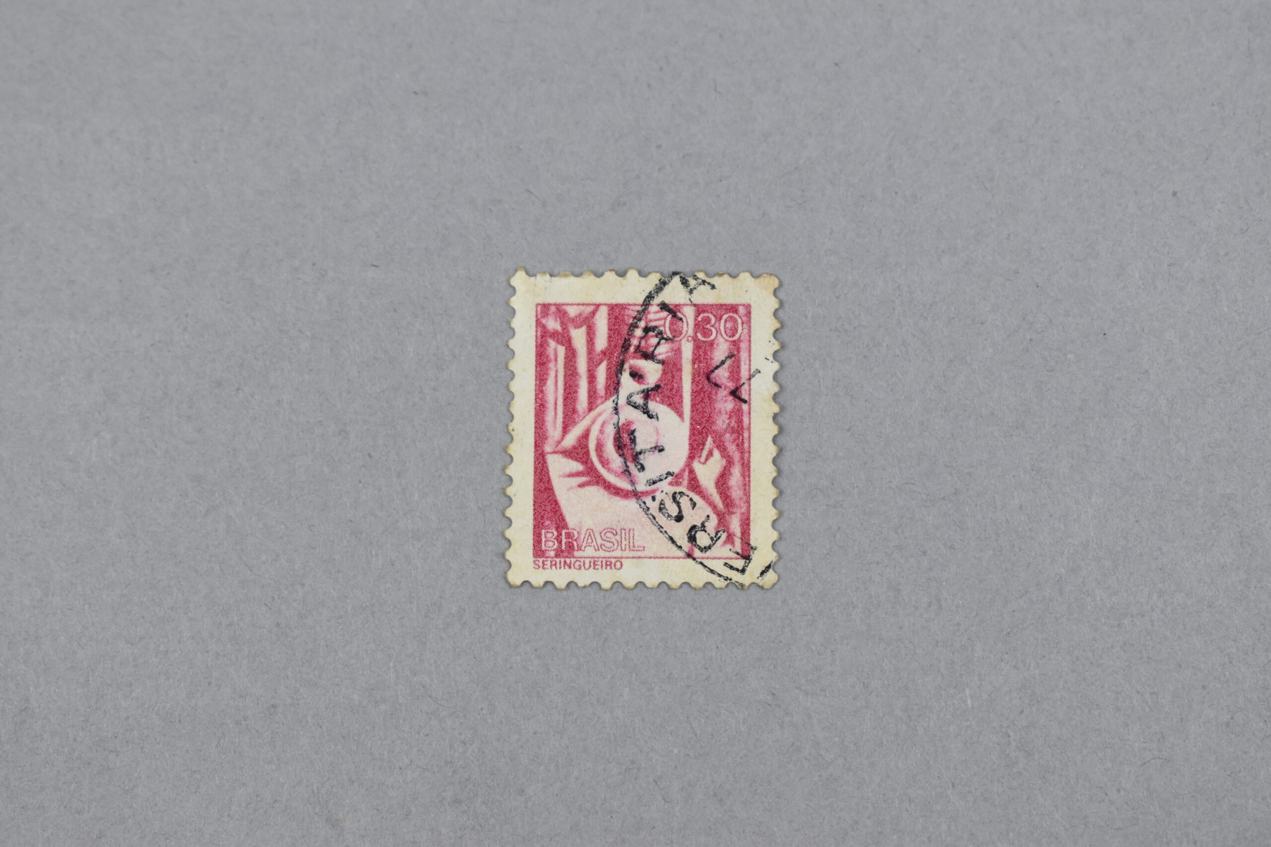 Estampilla que presenta un rectángulo de color rosado en cuya parte central se encuentra la ilustración de un «SERINGUEIRO» (Cauchero), el cual se encuentra realizando una incisión al árbol de caucho para poder extraer la materia prima. En la parte superior derecha en números blancos se puede observar el valor del ejemplar y en la parte inferior izquierda se encuentra impreso el nombre del país: «BRASIL». Fuera del rectángulo se puede apreciar el nombre en portugués del oficio en letras rosadas: «SERINGUEIRO»