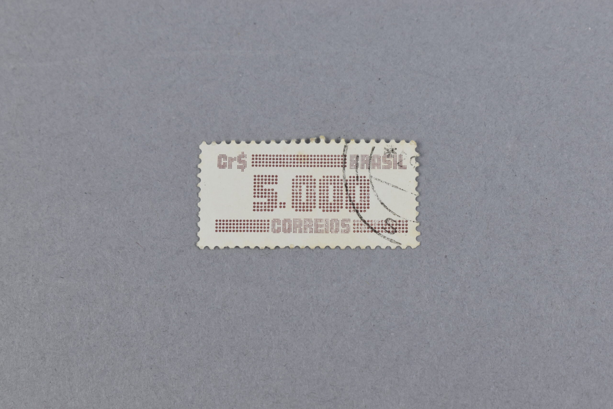 Estampilla rectangular de color blanco con letras y puntos color marrón rojizo, los cuales forman tanto rectángulos como palabras, resaltando en la parte central lo que parece ser el número 5000 que a la vez funge como su valor facial. El código de la moneda se encuentra en la esquina superior izquierda (Cr$) y el nombre del país: “BRASIL” en la esquina superior derecha. En la parte inferior, cerrada por dos rectángulos hechos de puntos, se encuentra la palabra “CORREIOS” (Correos).