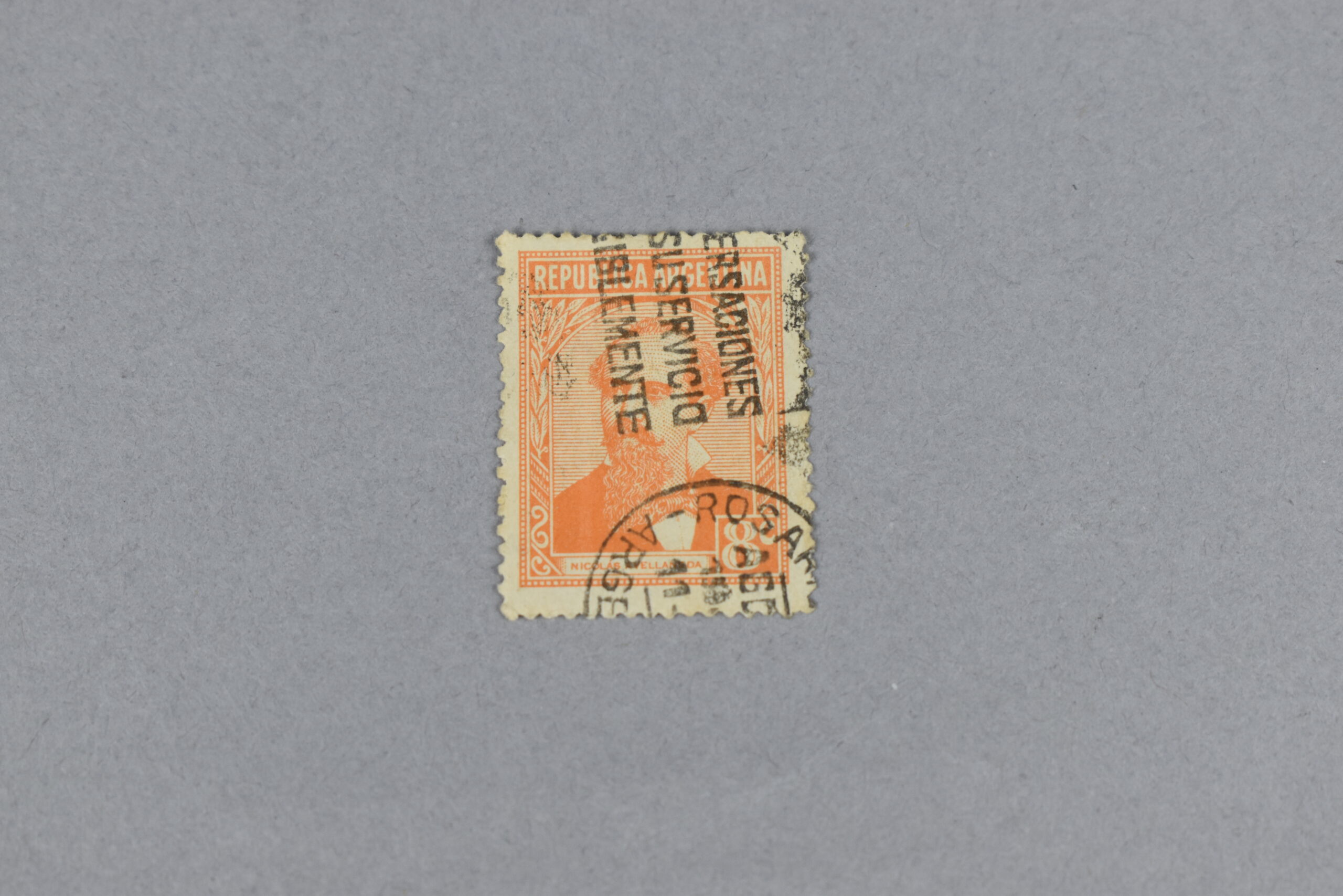 Estampilla que presenta un rectángulo color naranja con ilustraciones de hojas y otros motivos botánicos en ambos lados, en cuya parte central se encuentra el retrato de perfil derecho del abogado presidente argentino: «Nicolás Avellaneda» (1837-1885). En la parte inferior izquierda se encuentra un cuadrado con el valor del ejemplar, así como impreso dentro de un fondo blanco el nombre del personaje: «NICOLÁS AVELLANEDA». En la parte superior sobre un fondo verde pino sobre letras blancas se puede observar el nombre del país: «REPÚBLICA ARGENTINA». En el rostro se pueden apreciar algunas letras estampadas, a su vez en la parte inferior se encuentra un matasello a la mitad.