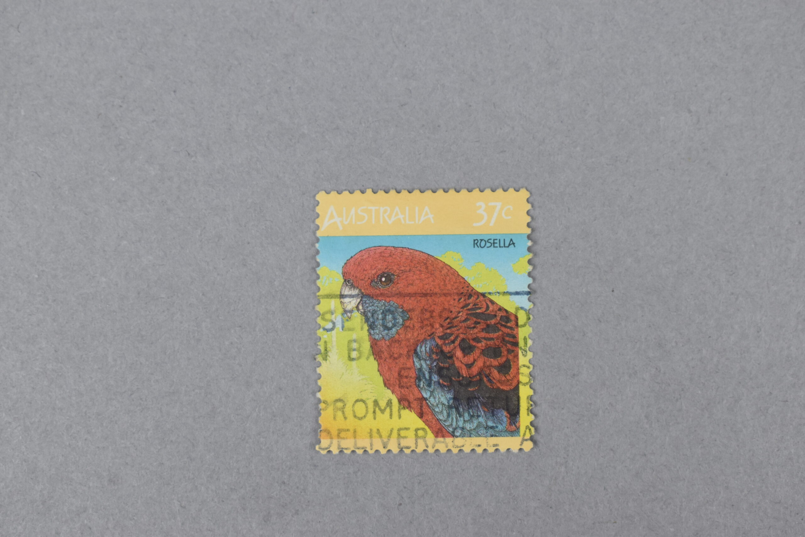 Estampilla que presenta un ave: «Rosella» (Perico de cola ancha) sobre un fondo celeste, verde, amarillo y anaranjado, teniendo el nombre del ave cerca de su cabeza, en el lado derecho. En la parte superior se encuentra un encuadre color anaranjado en donde se encuentran impresos en letras y números de color blanco el nombre del país: «AUSTRALIA» y el valor facial del ejemplar. Existe también la presencia de un sello rectangular con texto en inglés e incompleto desde la parte inferior al centro.