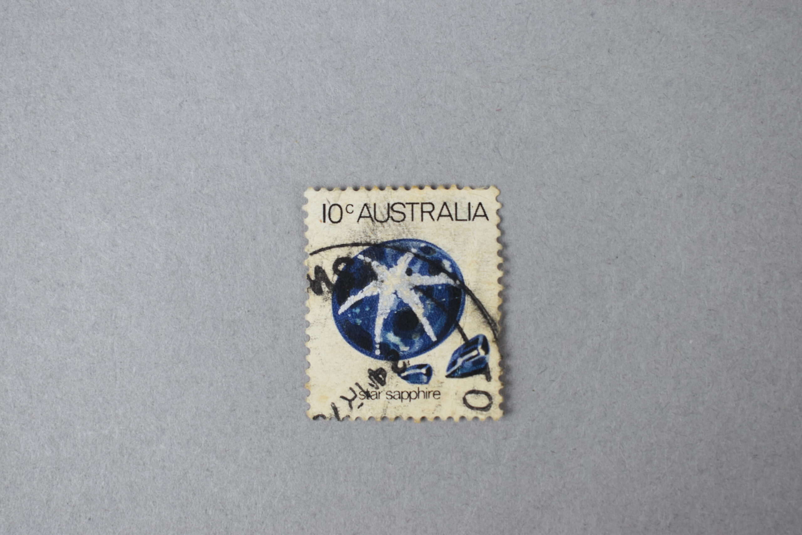 Estampilla que presenta una ilustración del mineral corindón: «Star Sapphire» (Zafiro estrella), el cual está ubicado en sobre un fondo blanco. En la parte superior se encuentran impresos en letras y números negros el nombre del país: «AUSTRALIA» y el valor facial del ejemplar. En la parte inferior se encuentra el nombre del ejemplar en letras negras: «star sapphire» y presenta un sello incompleto con un texto ininteligible.