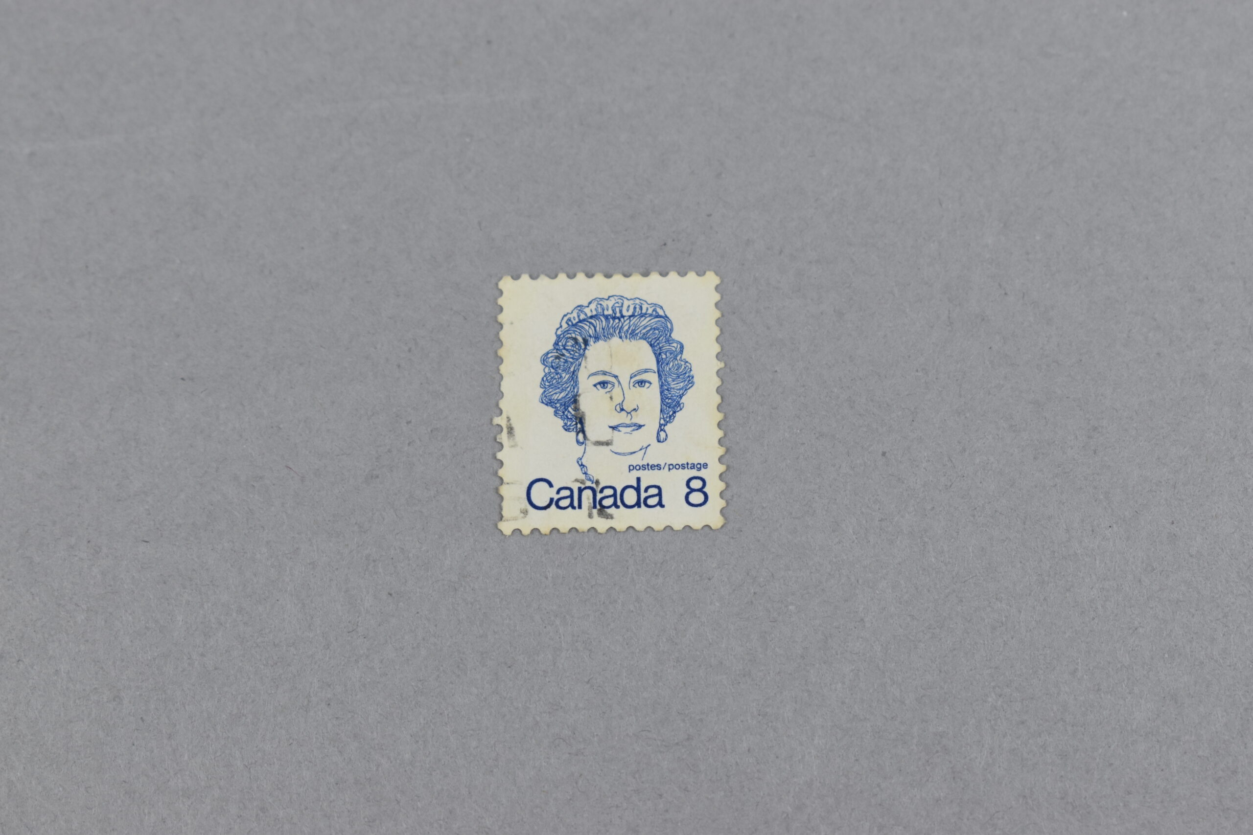 Estampilla que presenta un retrato de color azul de la Jefa de Mancomunidad de Naciones y reina de Canadá: «Isabel II» (1926-2022). Se puede apreciar en letras azules el nombre del país, el valor facial del ejemplar y la palabra correo en dos idiomas: postes (francés) y postage (inglés).