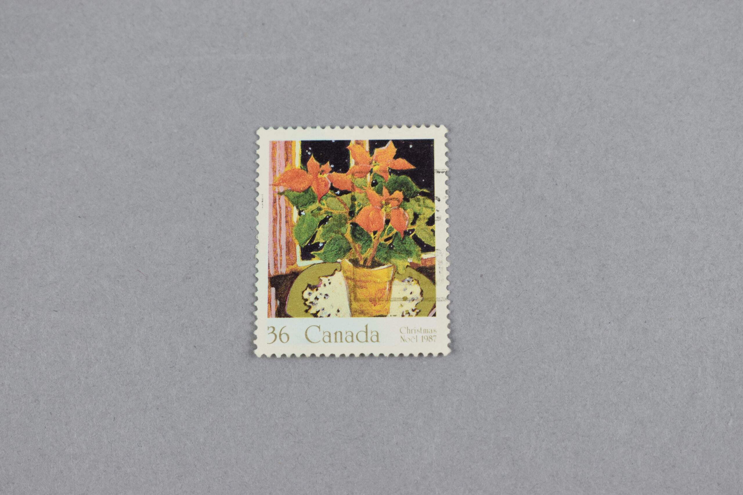 Estampilla que presenta una ilustración de algunos ejemplares de la «Flor de Pascua» (Euphorbia pulcherrima) dentro de una maceta sobre el mantel de una mesa y teniendo de fondo a una ventana. En la parte inferior se encuentran tanto el valor facial del ejemplar y la palabra «navidad» en dos idiomas: Christmas (inglés) y Noël (francés), además del año de su emisión: «1987».