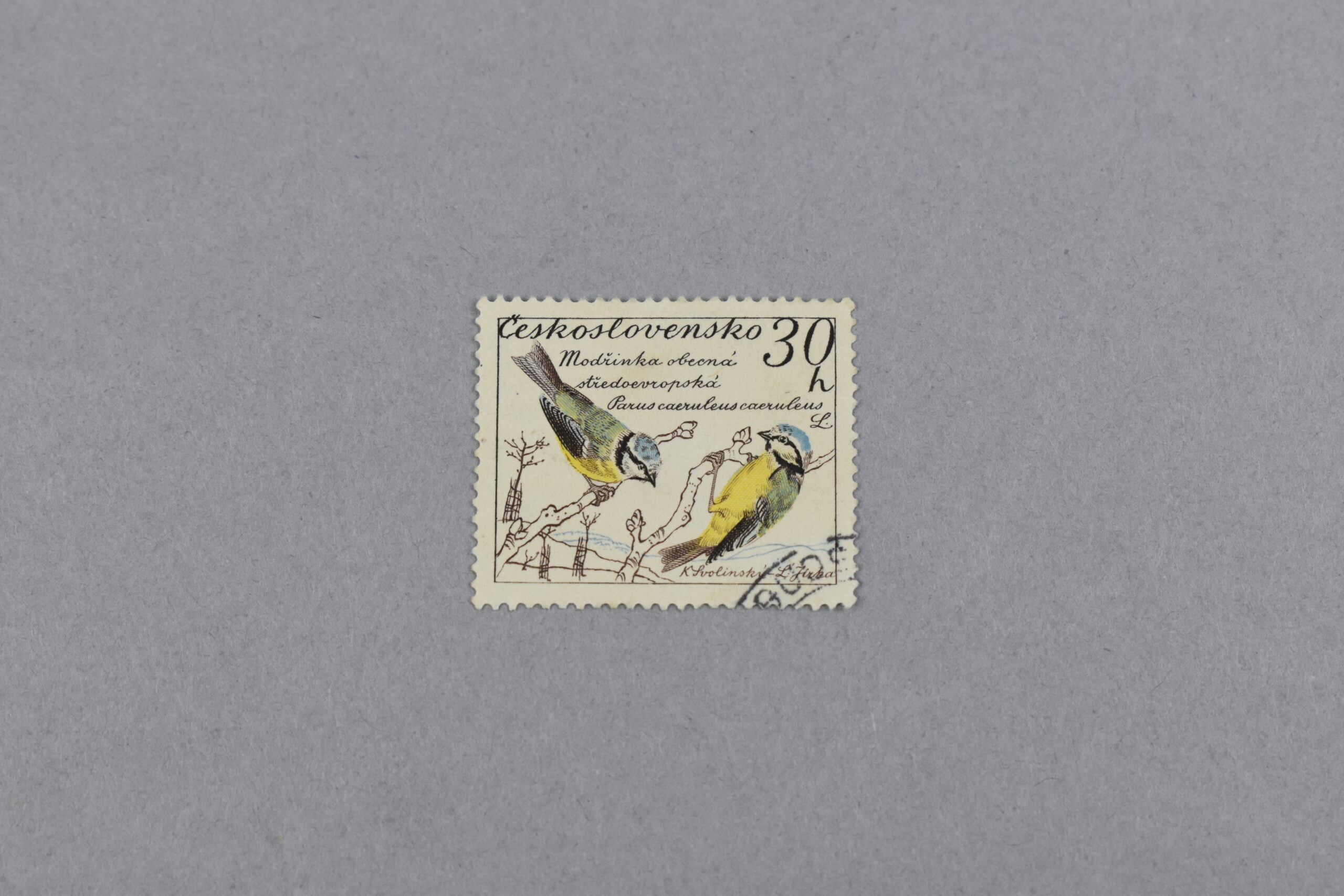 Estampilla que presenta en su parte central una ilustración de dos ejemplares de la especie: «Parus Caeruleus» (Herrerillo común) quienes están posados sobre ramas. En la parte superior se puede ver el nombre del país, así como el valor facial de la estampilla. El texto se traduce como: «Herrerillo común europeo Parus caeruleus caeruleus» y debajo de la ilustración están los nombres de los autores de esta: K (Karel) Svolinsky y L (Ladislav Jirka).