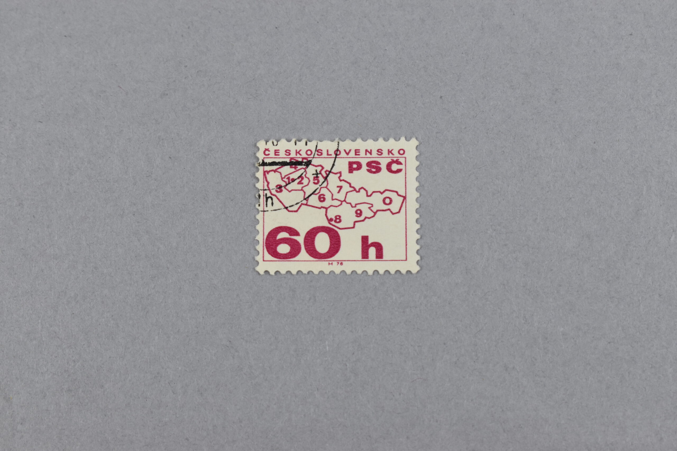 Estampilla que presenta en su parte central un mapa de color rojo el cuál muestra tanto la extensión de Checoslovaquia y presumiblemente la división territorial de sus regiones las cuales se podrían identificar con los números que se encuentran ahí. El valor facial se encuentra en la parte inferior y en la esquina superior derecha están las siglas: PSČ (Poštovní Směrovací Číslo), traducido significa: Cógido Postal.