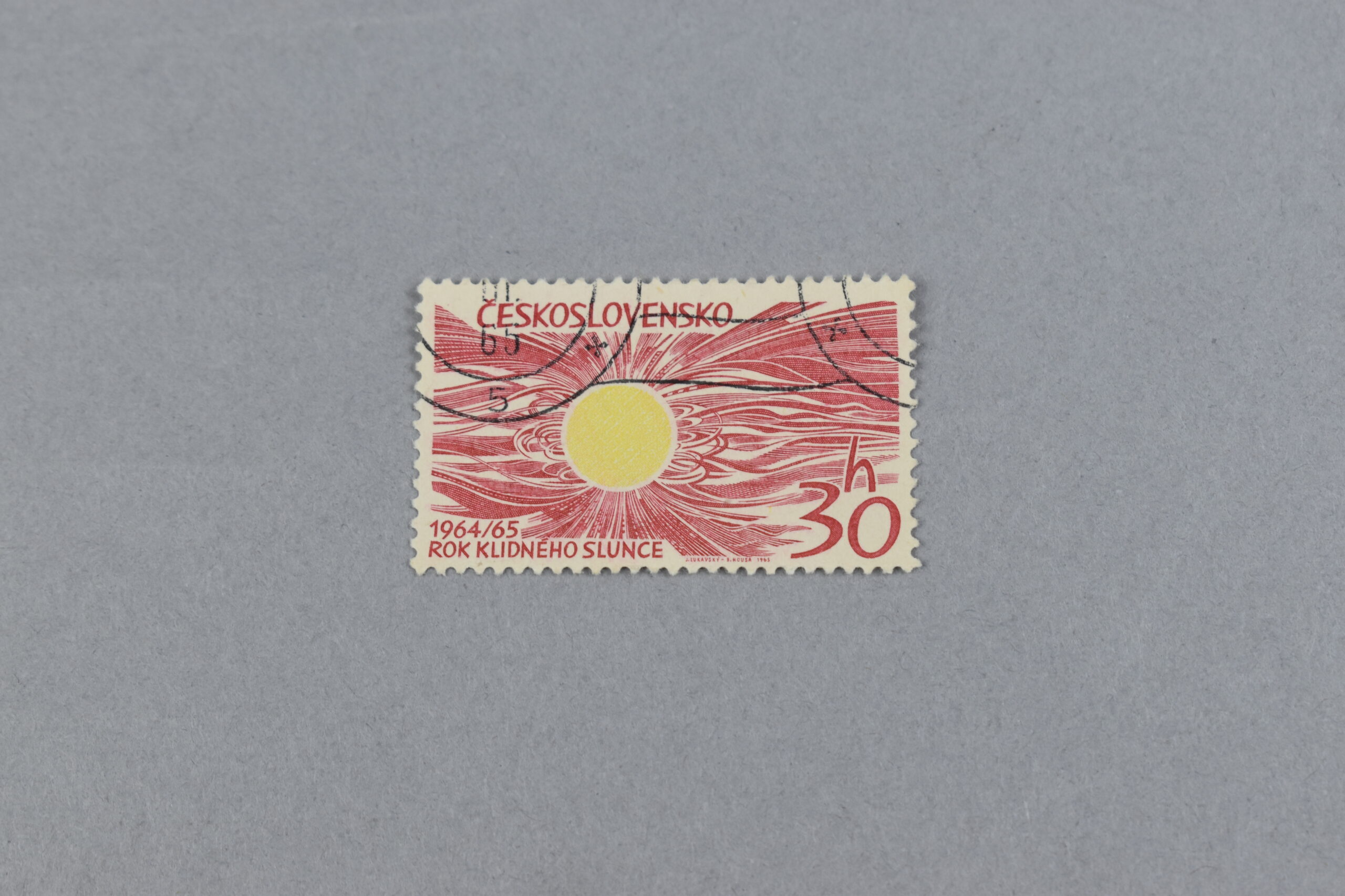 Estampilla que presenta en su parte central una ilustración del sol en color amarillo y su campo magnético en color rojo. En la parte inferior se puede leer: «1964/65 ROK KLIDNÉHO SLUNCE» traducido significa: «Año del Sol Tranquilo», acontecimiento impulsado por la Unión Soviética que reunió un grupo de 70 geofísicos para estudiar las relaciones entre el sol y la tierra. En la esquina inferior izquierda se encuentra el valor facial del ejemplar.