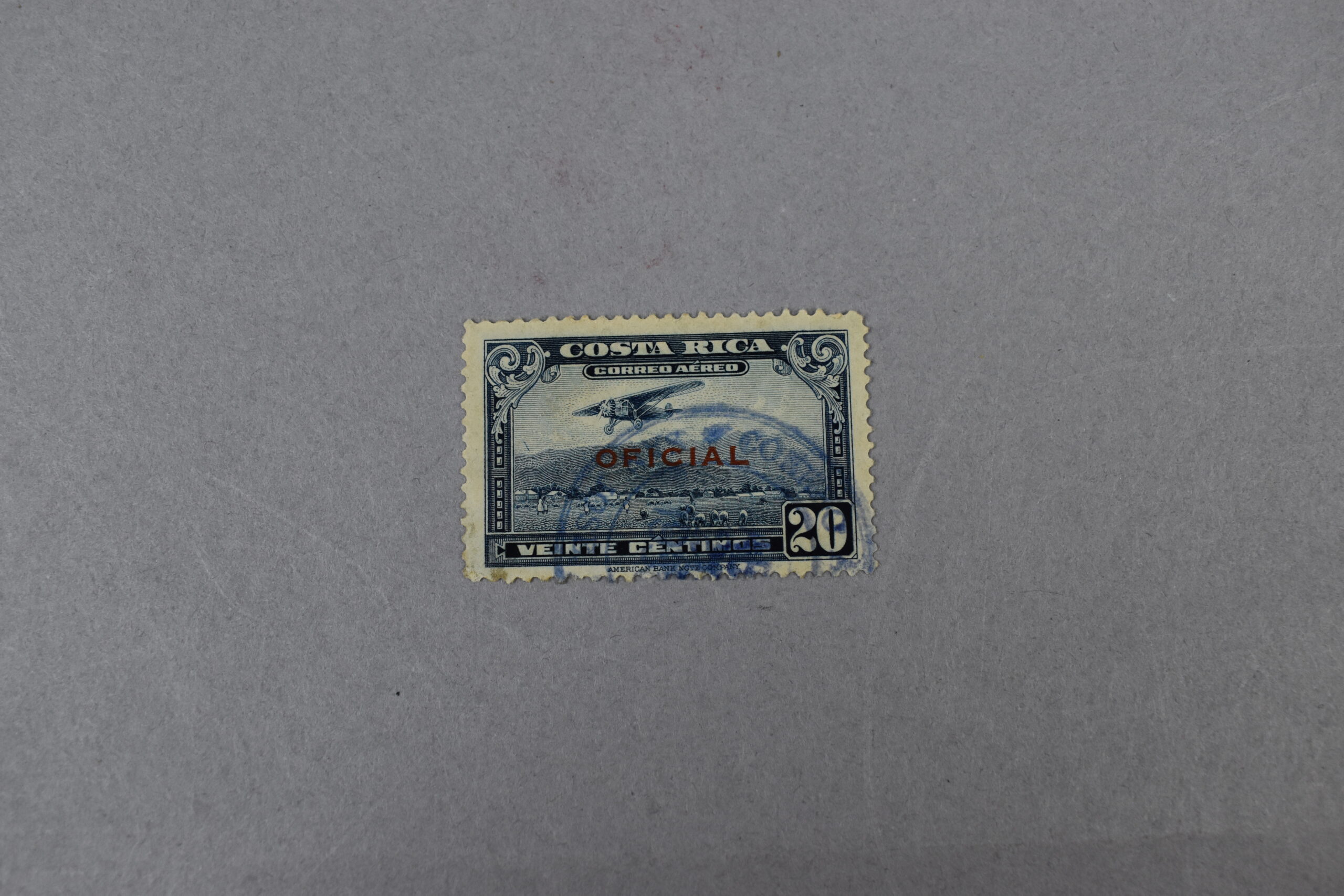 Estampilla que presenta un rectángulo de color verde, en cuyo centro se encuentra la ilustración de un avión monoplaza sobrevolando un área rural y ganado, como también teniendo de fondo una cadena montañosa. En la esquina inferior derecha se encuentra el valor facial del ejemplar, en la parte superior se encuentra el nombre del país y la institución que lo emite. Fuera del rectángulo se encuentra impreso: «AMERICA BANK NOTE COMPANY»