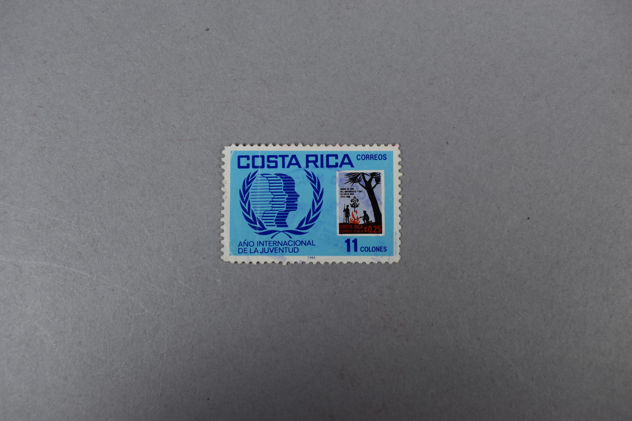 Estampilla que presenta un rectángulo de color celeste y dentro de este se han incluido dos ilustraciones: la primera hace referencia al «Año Internacional de la Juventud» de 1984 con tres rostros enmarcados por dos ramas de laurel y una ilustración de dos jóvenes encendiendo una fogata en el bosque en conmemoración de las bodas de oro del movimiento scout en Costa Rica (1916-1966). Arriba de los rostros se encuentra el nombre del país, secundado por la palabra «CORREOS», debajo de este el nombre del año y en la esquina inferior derecha el valor facial del ejemplar.