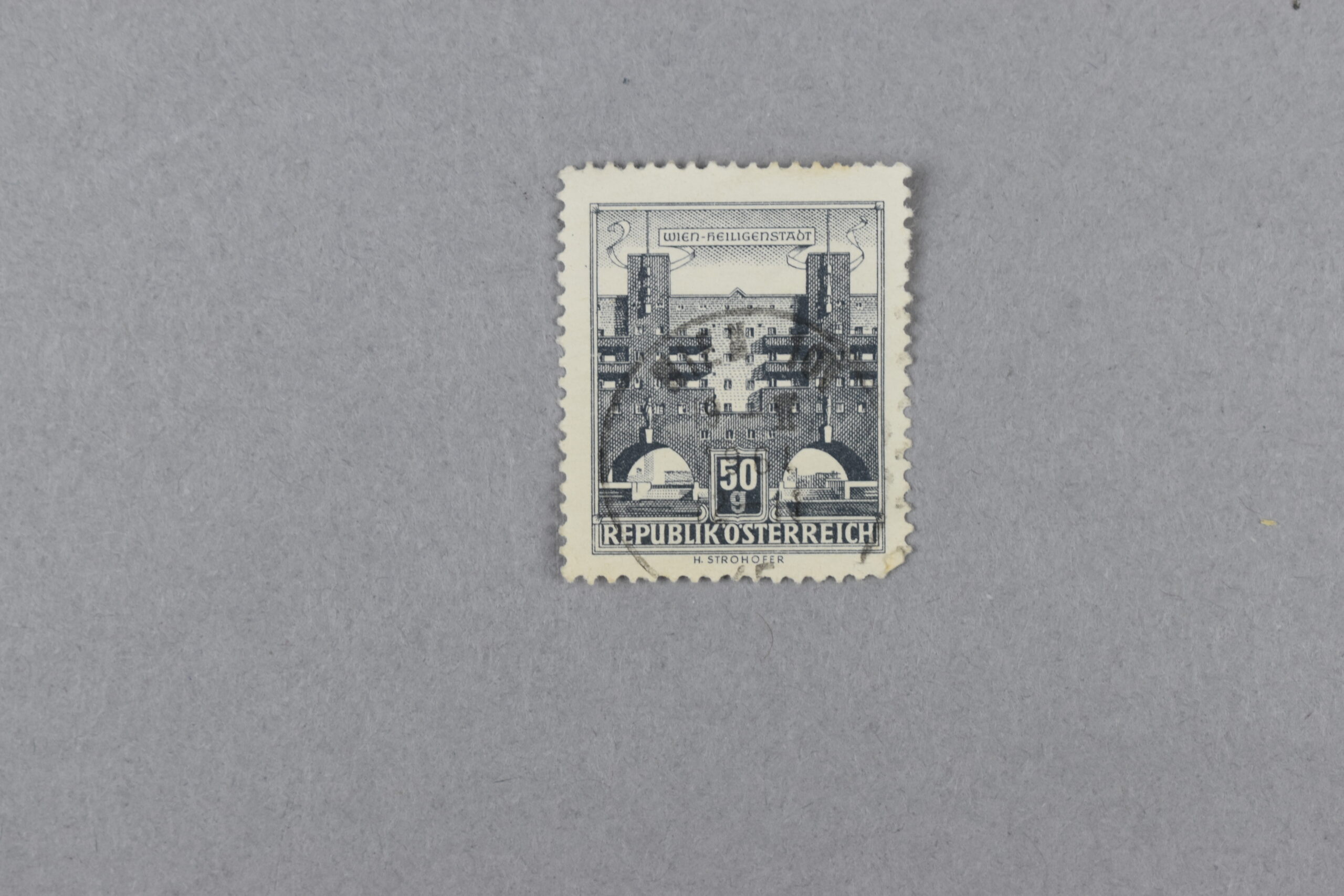 Estampilla de color negro las cuales exhiben en su parte central se encuentra la ilustración del «Karl Max Hof», uno de los edificios residenciales más grandes del mundo, situado en Döbling (anteriormente Heiligenstadt), muy cerca de Viena. En la parte superior se puede observar el nombre del lugar en donde se encuentra: «HEILIGENSTADT» y en la parte inferior se encuentran tanto el nombre del país como el valor facial del ejemplar.