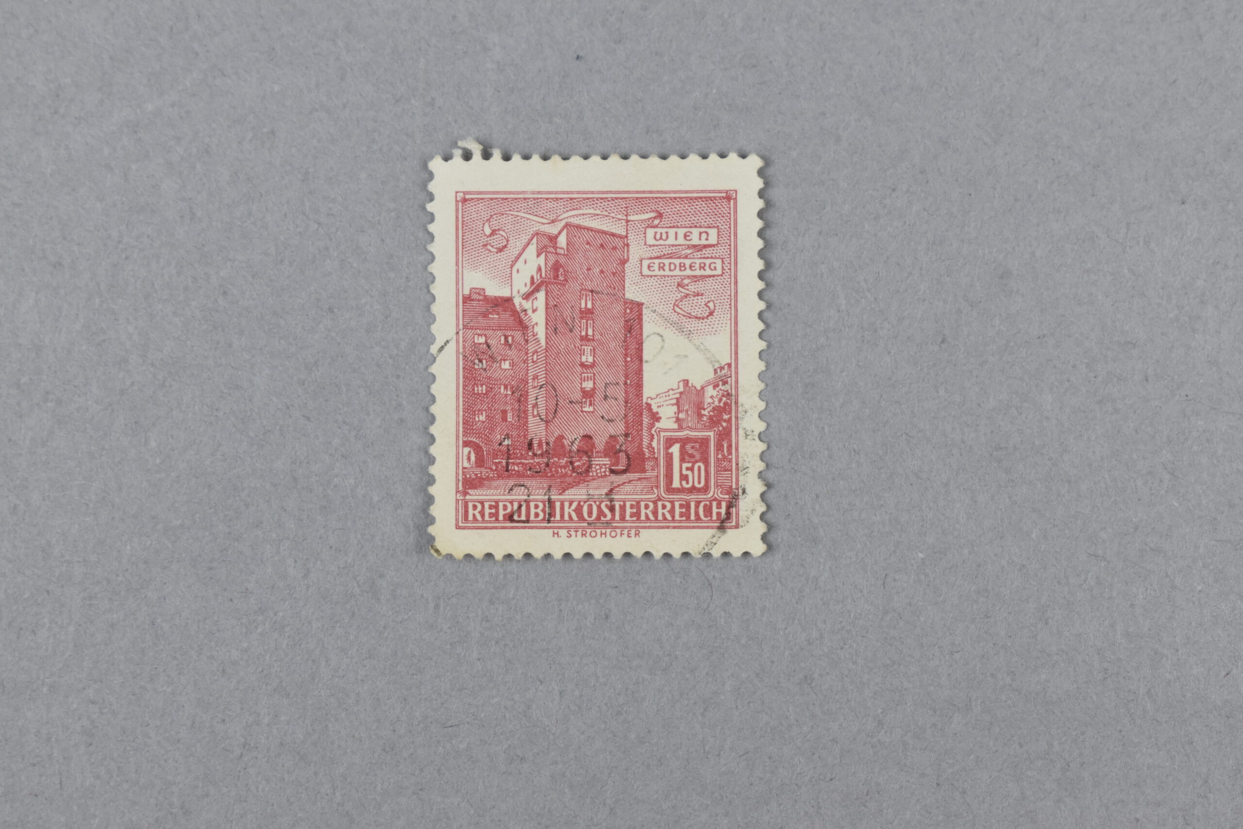 Estampilla de color rojo la cual presenta la ilustración de un edificio vertical, alto y de múltiples ventanas del distrito de Edberg, situado en Viena. Este edificio contrasta en tamaño con los demás y posee menos detalles a comparación del edificio de su costado o los del fondo.