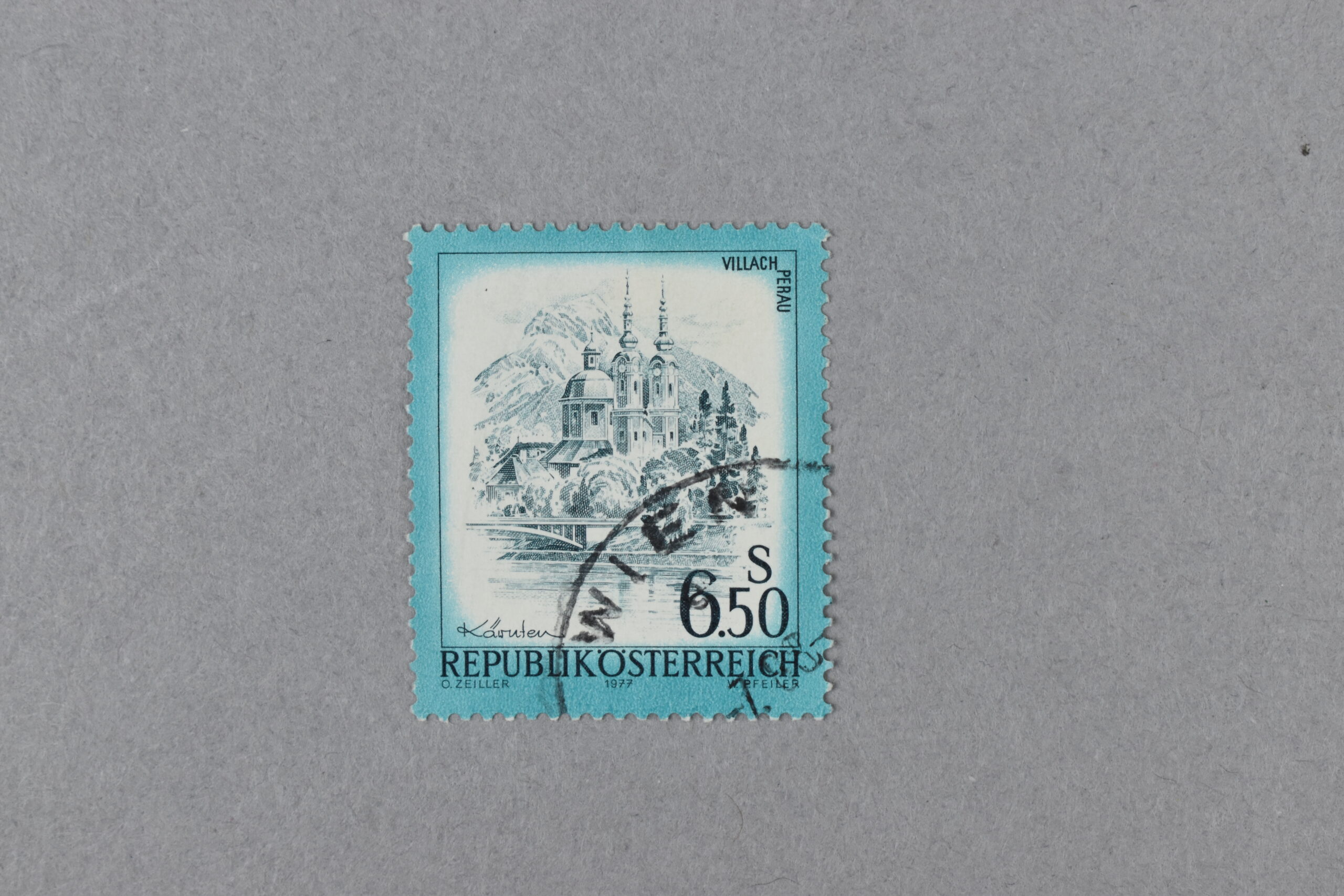 Estampilla de color turquesa que presenta la ilustración de parroquia «Heiligenkreuzkirche» (traducido: Iglesia de la Santa Cruz), cuya estructura expuesta data del año 1738 y es un lugar de peregrinación importante en Perau. Se encuentra en Villach, dentro de la región de Carintia (Kärnten) y se aprecia vegetación a su alrededor, así como una montaña de fondo. El ejemplar fue emitido en el año 1977.
