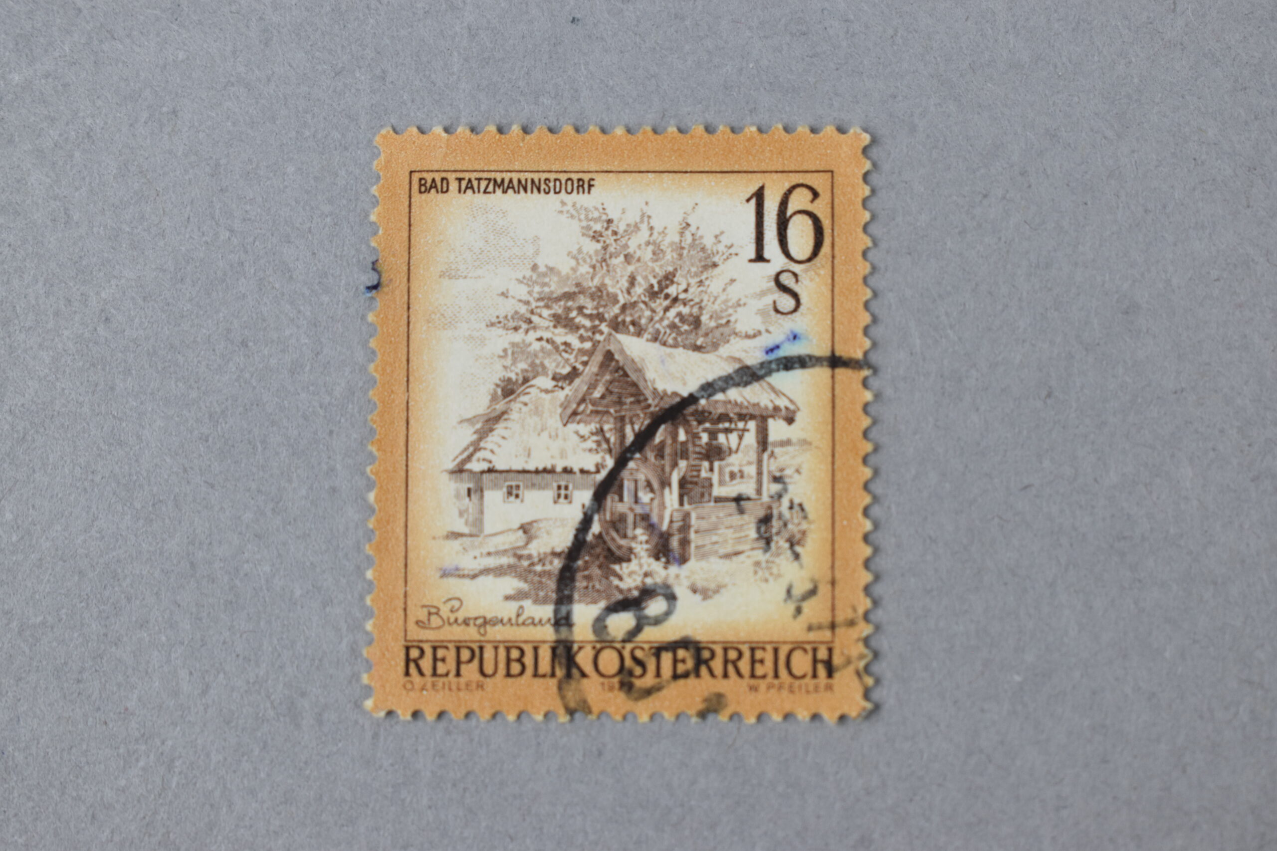 Estampilla de color melón la cuál exhibe una ilustración referente a una casa tradicional de la localidad austríaca de Bad Tatzmannsdorft, en la región de Burgenland. Esta tiene un techo de paja y madera, un pozo de agua con estructura de madera, mecanismos y techo de paja además de presentarse un árbol. El ejemplar fue emitido en el año 1979.