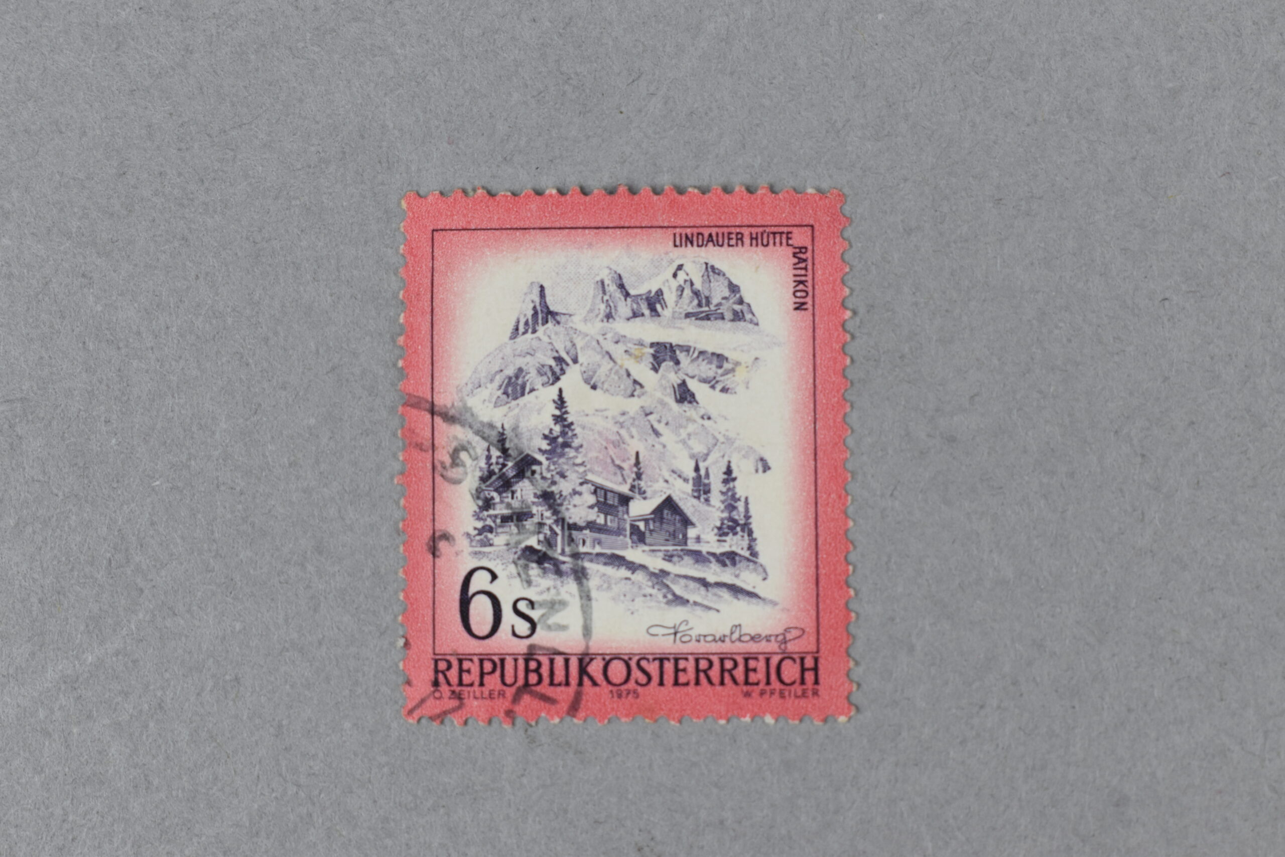 Estampilla de color rojo la cual exhibe una ilustración referente a la Lindauer Hütte (o Cabaña de Lindauer) situada cerca del macizo de Rätikon, lugar conocido por ser el preferido para practicar esquí y montañismo, además de encontrarse con varios lugares para hospedarse y descanasar. Se puede observar la mencionada cabaña al pie del macizo. El ejemplar fue emitido en el año 1975.