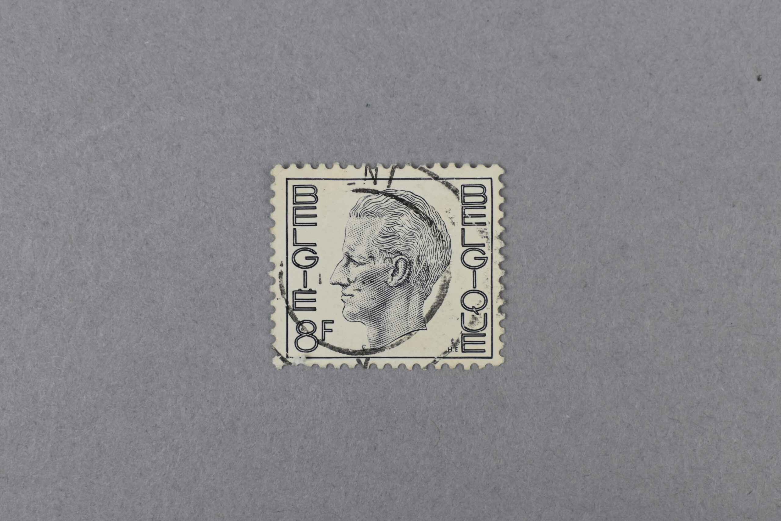 Estampilla de color blanco que muestra en su interior el retrato de perfil izquierdo del Rey de los Belgas: Balduino de Bélgica (1930-1993), quién reinó desde el año 1951 hasta su muerte en 1993. Se puede apreciar el nombre del país en dos idiomas, en neerlandés: «België» y en francés: «Belgique».